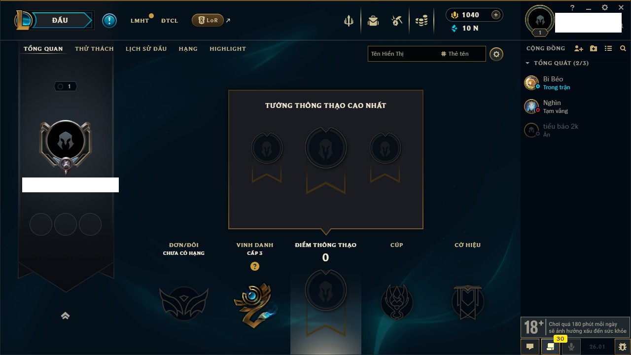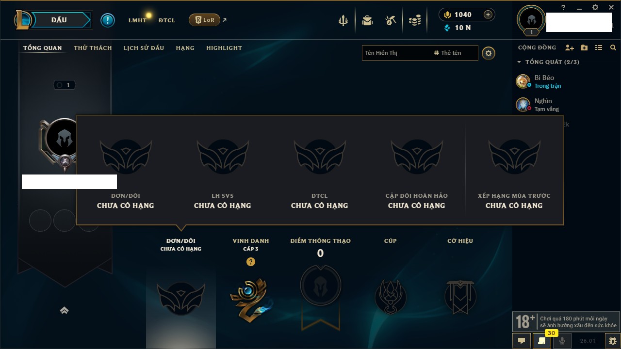 Rank Đơn: Chưa rank mùa nào Khung: Chưa có khung Tướng: 0 - Còn 0 THX Trang Phục: 0 Rank ĐTCL: Chưa Rank Linh Thú: 4