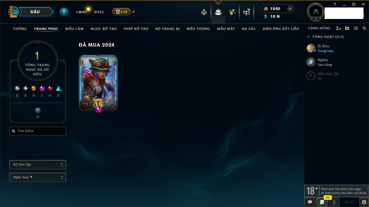 Rank Đơn: Chưa rank mùa nào Khung: Chưa có khung Tướng: 0 - Còn 10050 THX Trang Phục: 1 Rank ĐTCL: Chưa Rank Linh Thú: 143