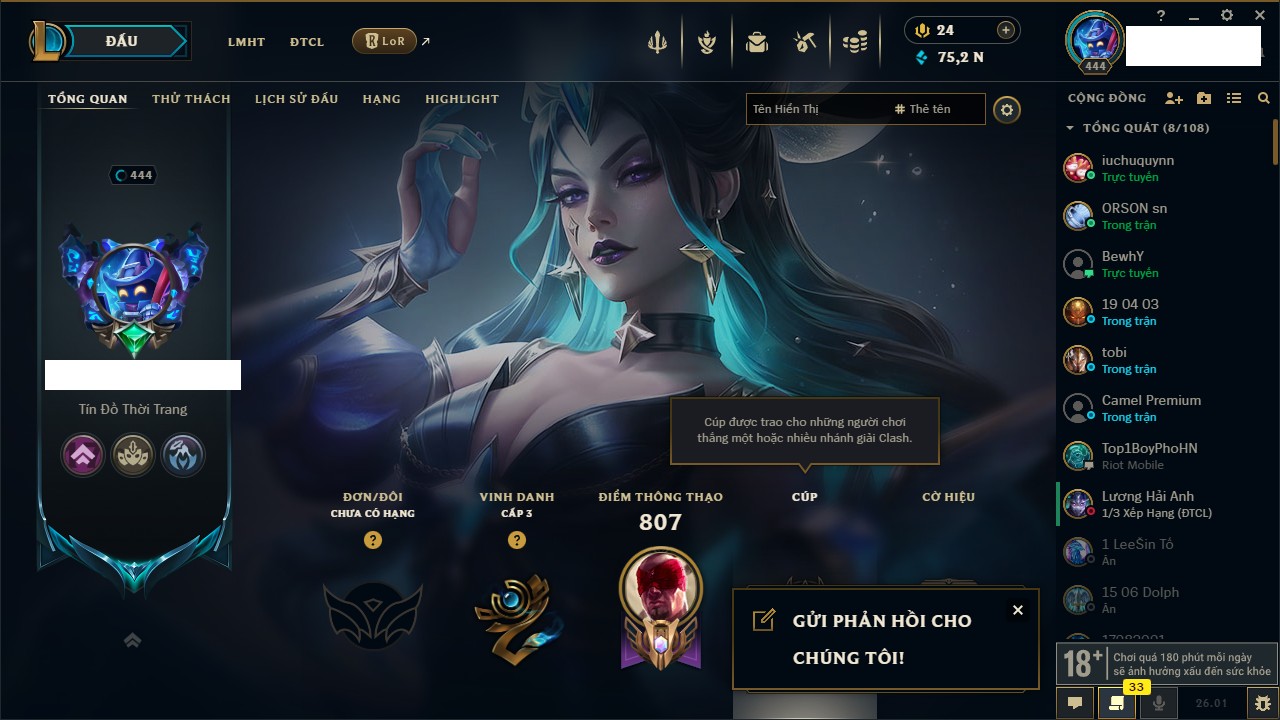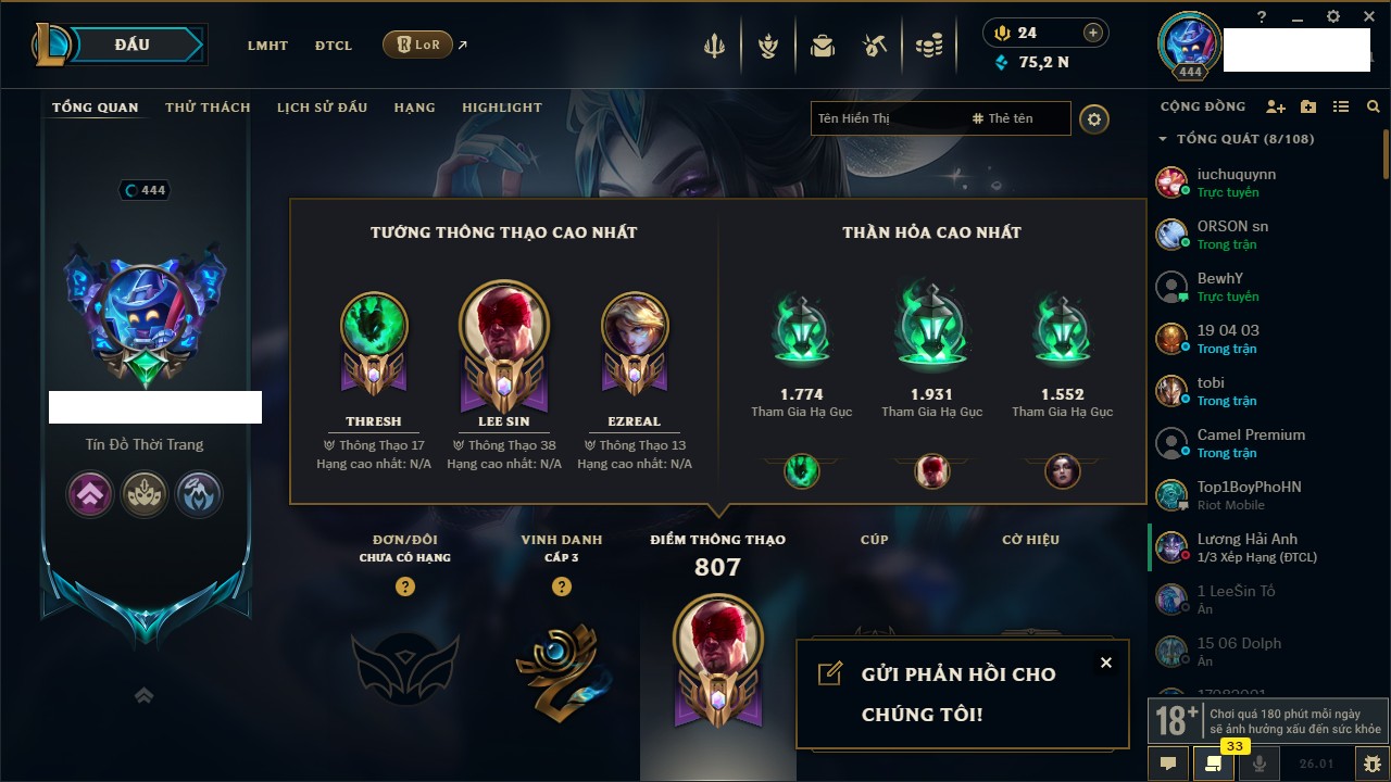 Rank Đơn: Chưa RankKhung: Chưa có khungTướng: 171 - Còn 75227 THXTrang Phục: 425Rank ĐTCL: Chưa RankLinh Thú: 201