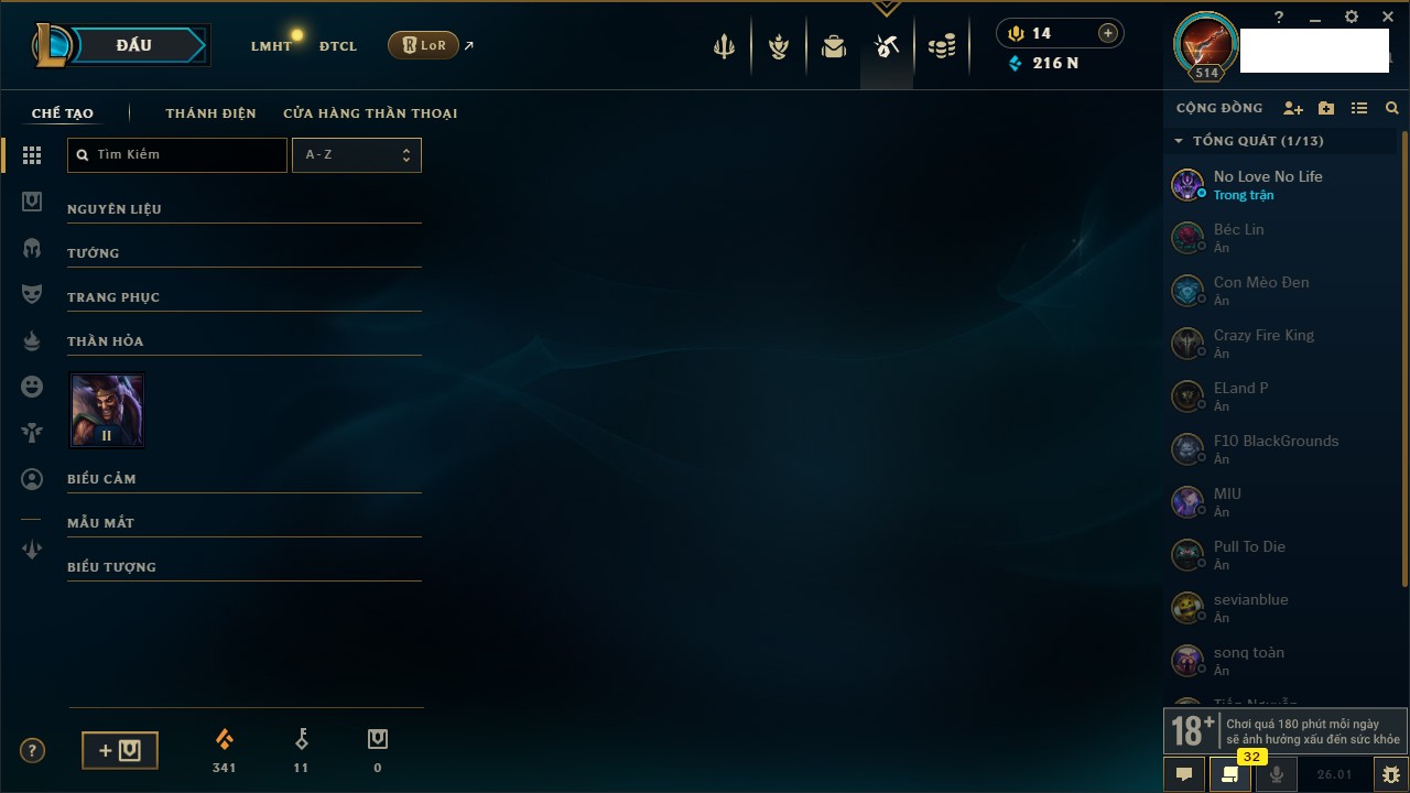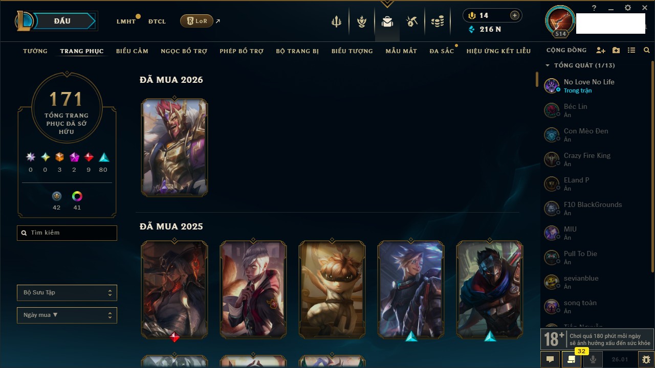 Rank Đơn: Chưa RankKhung: VàngTướng: 171 - Còn 125195 THXTrang Phục: 216Rank ĐTCL: Đồng IILinh Thú: 38