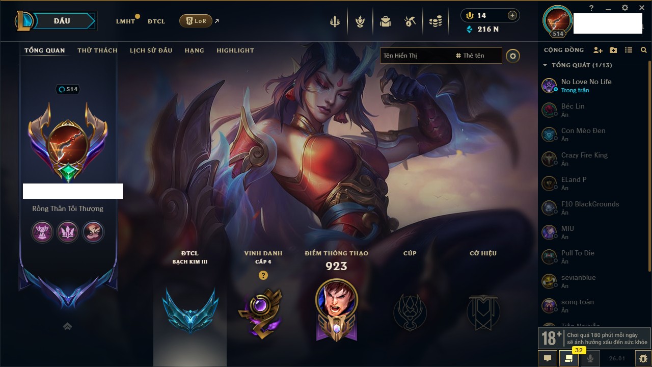 Rank Đơn: Bạch Kim IVKhung: Bạch kimTướng: 171 - Còn 84321 THXTrang Phục: 174Rank ĐTCL: Chưa RankLinh Thú: 115