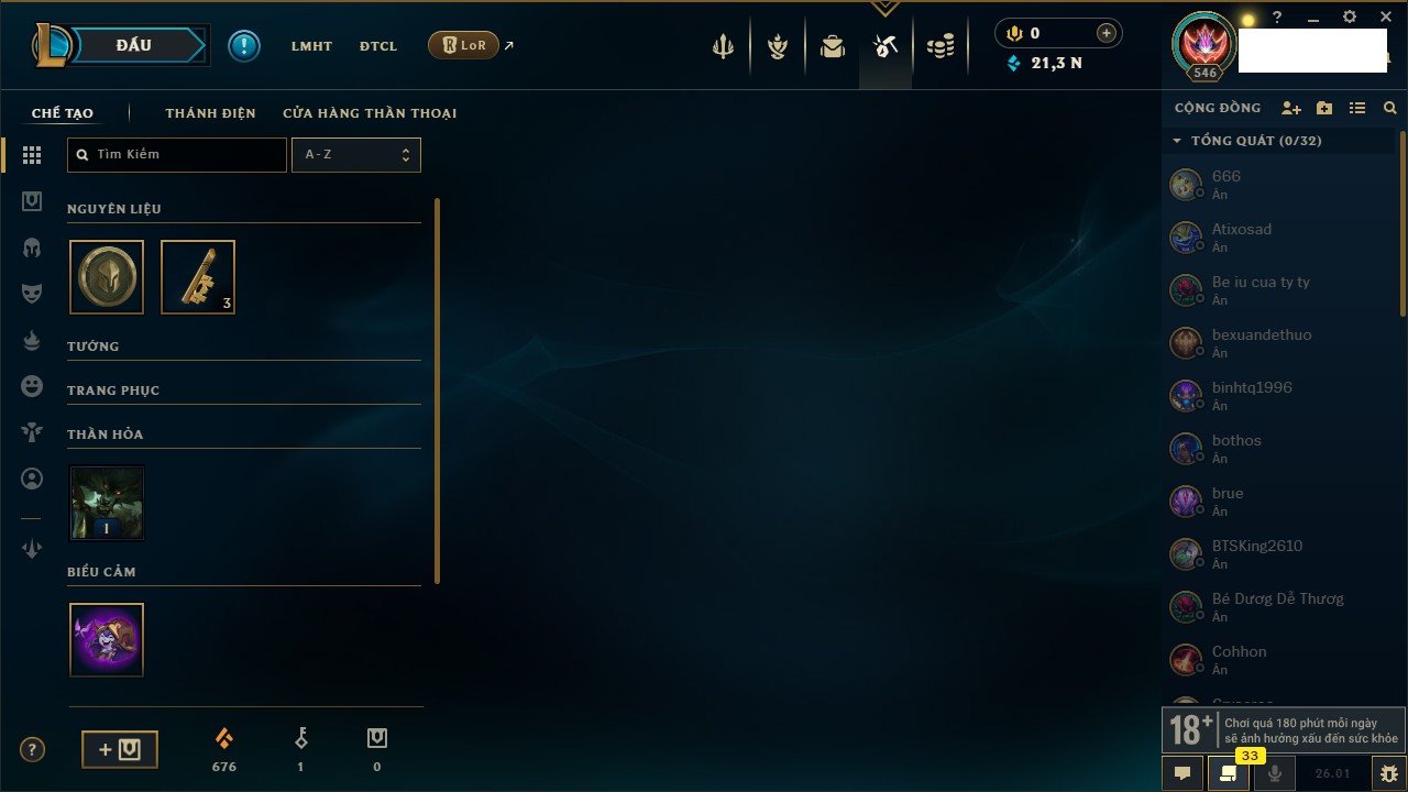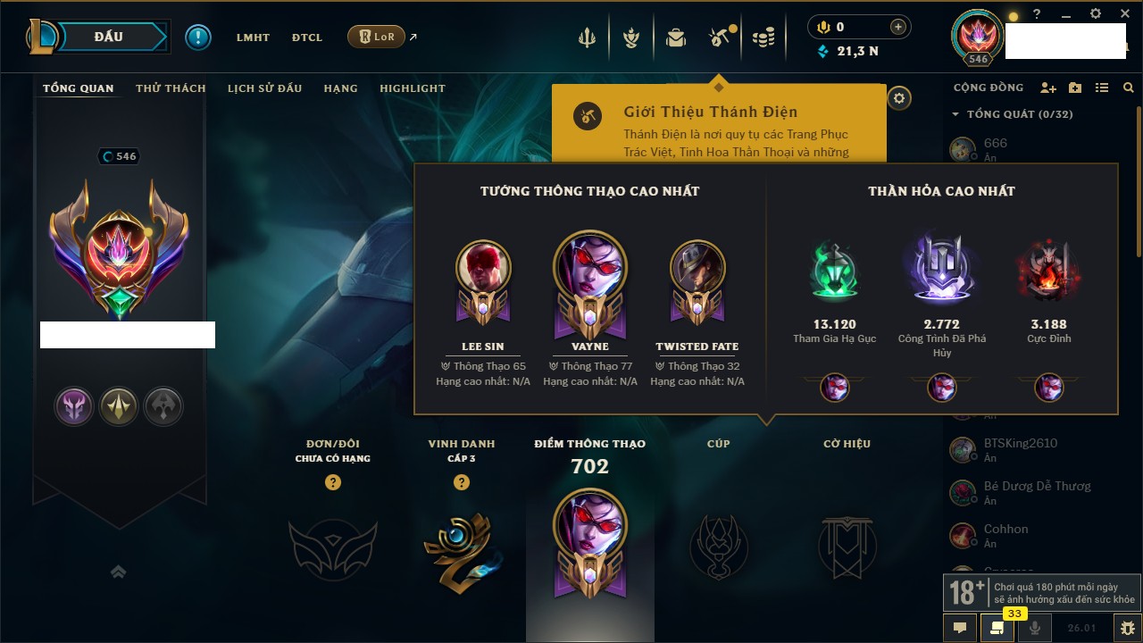 Rank Đơn: Chưa RankKhung: Chưa có khungTướng: 160 - Còn 21398 THXTrang Phục: 380Rank ĐTCL: Chưa RankLinh Thú: 27