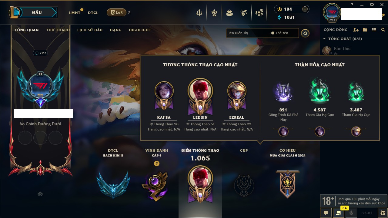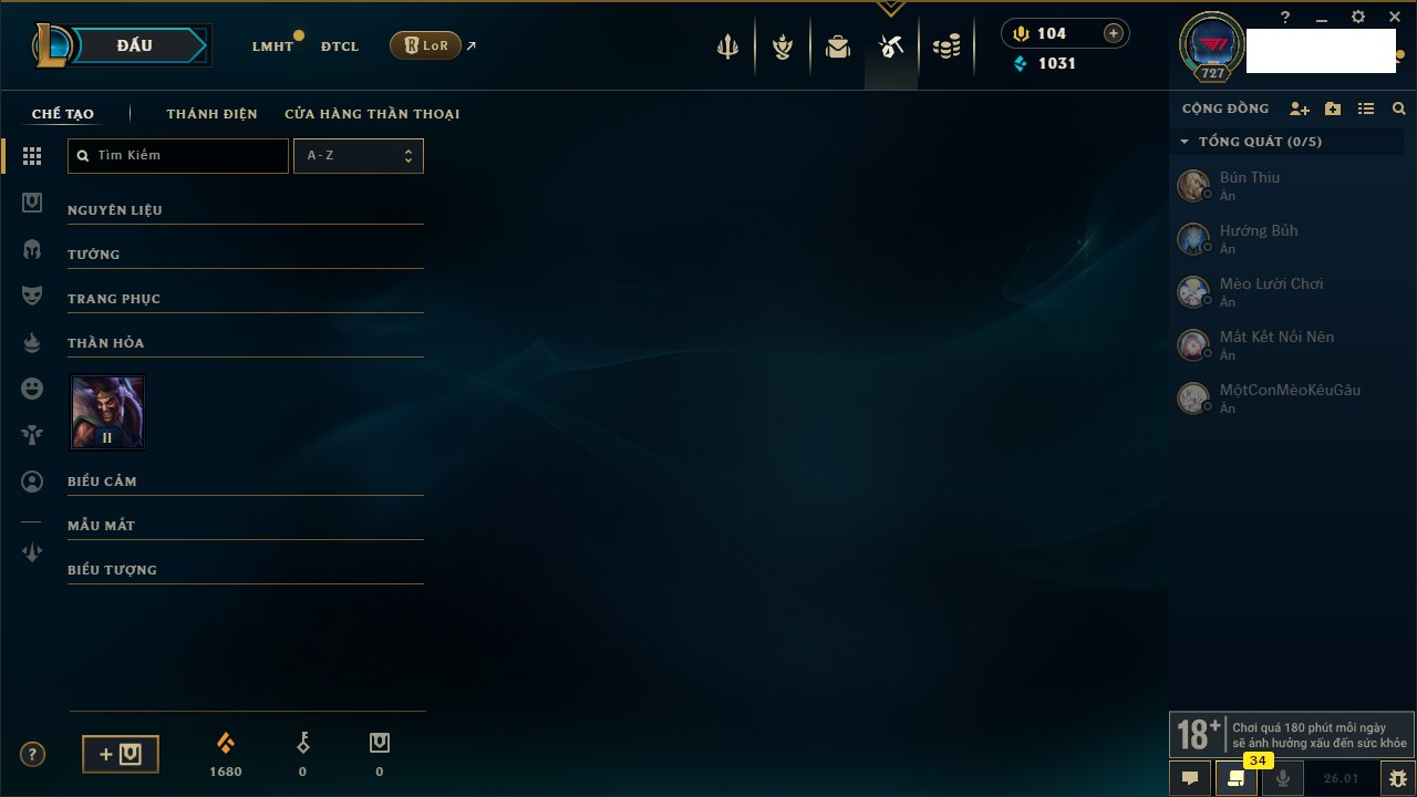 Rank Đơn: Vàng IV Khung: Chưa có khung Tướng: 172 - Còn 28576 THX Trang Phục: 690 Rank ĐTCL: Vàng IV Linh Thú: 159