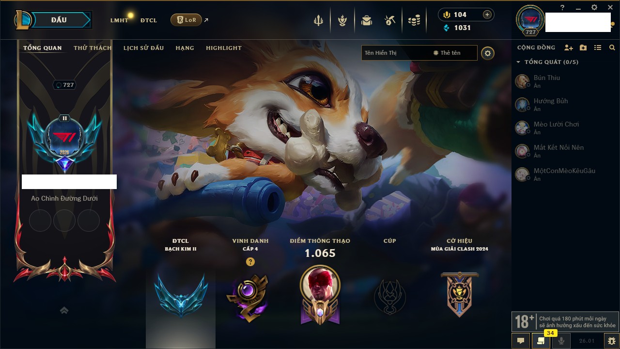 Rank Đơn: Chưa Rank Khung: Bạch kim Tướng: 170 - Còn 73280 THX Trang Phục: 577 Rank ĐTCL: Chưa Rank Linh Thú: 84