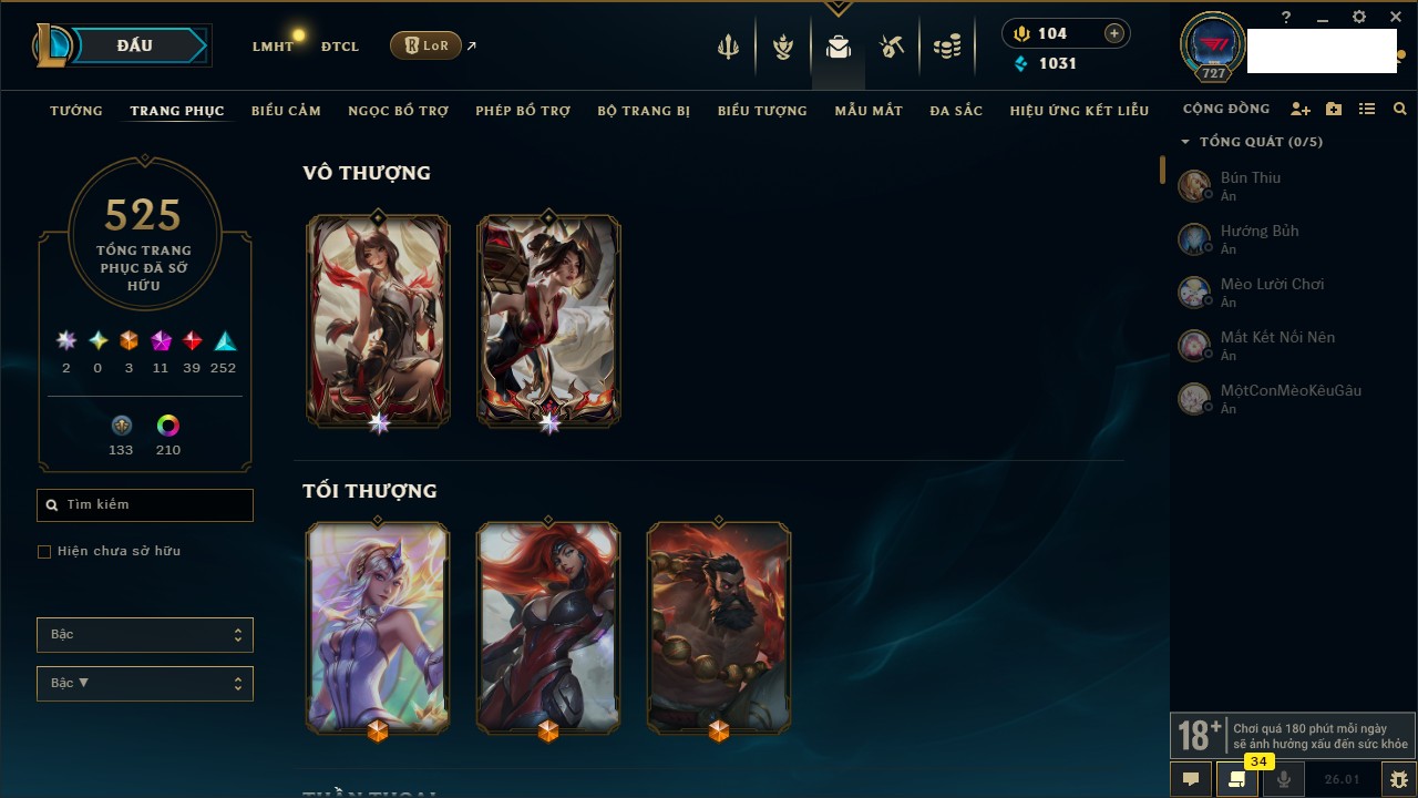 Rank Đơn: Chưa rank mùa nào Khung: Chưa có khung Tướng: 30 - Còn 5140 THX Trang Phục: 3 Rank ĐTCL: Chưa rank mùa nào Linh Thú: 221