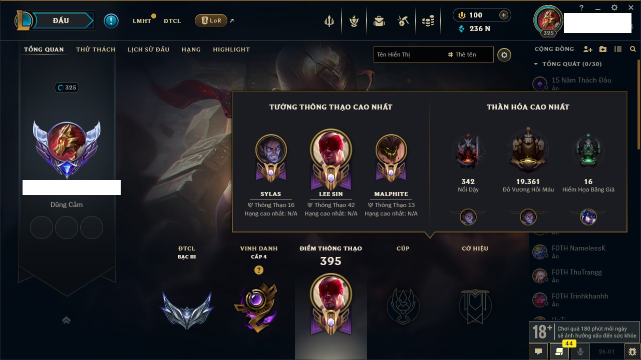Rank Đơn: Bạc IKhung: Chưa có khungTướng: 172 - Còn 189559 THXTrang Phục: 182Rank ĐTCL: Chưa RankLinh Thú: 96