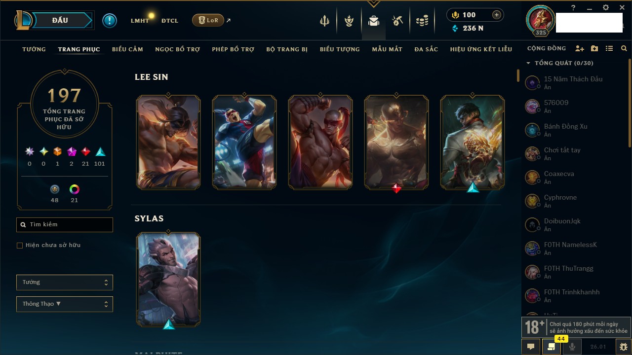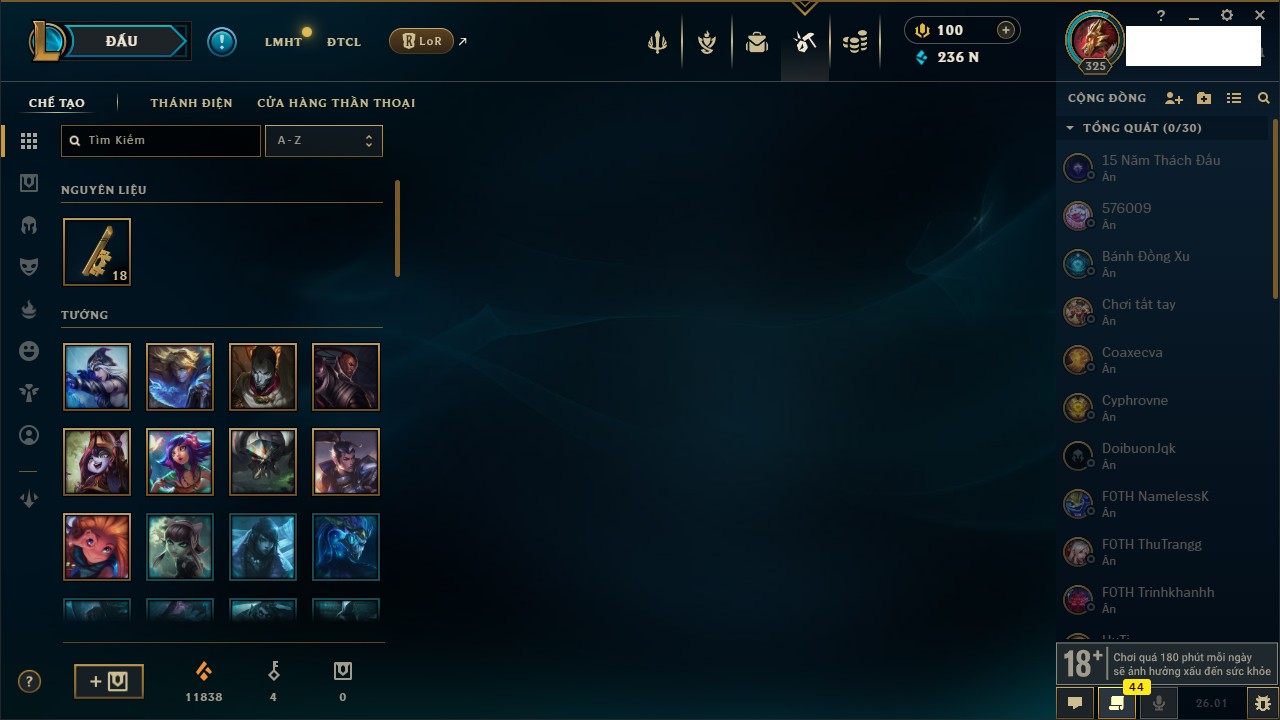 Rank Đơn: Chưa RankKhung: VàngTướng: 143 - Còn 16814 THXTrang Phục: 29Rank ĐTCL: Chưa RankLinh Thú: 91