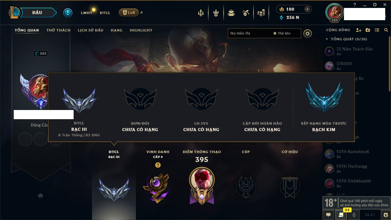 Rank Đơn: Chưa RankKhung: BạcTướng: 171 - Còn 101359 THXTrang Phục: 88Rank ĐTCL: Chưa RankLinh Thú: 200