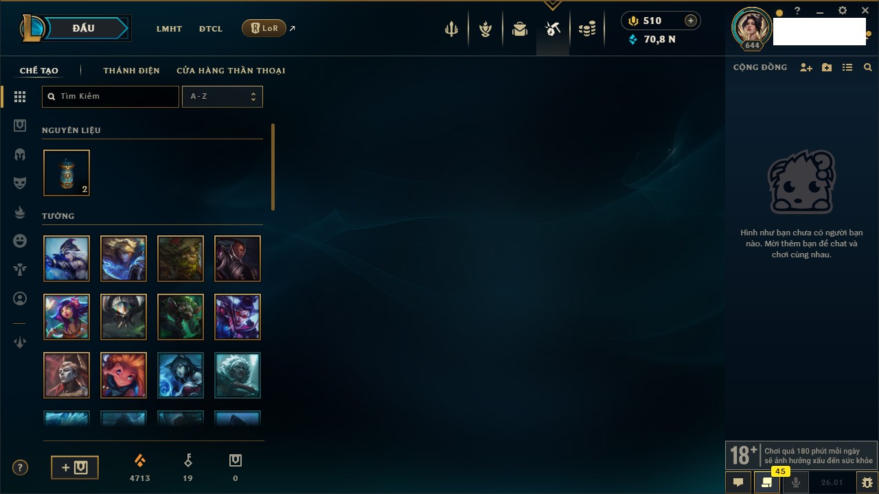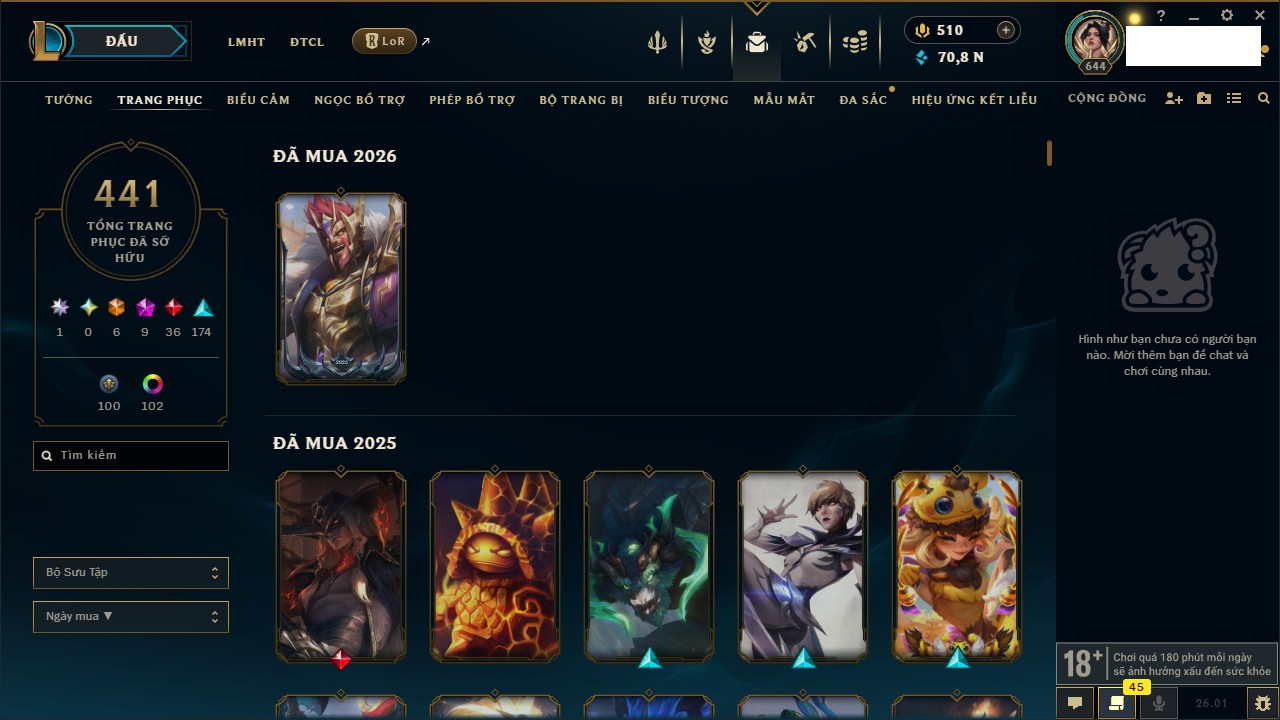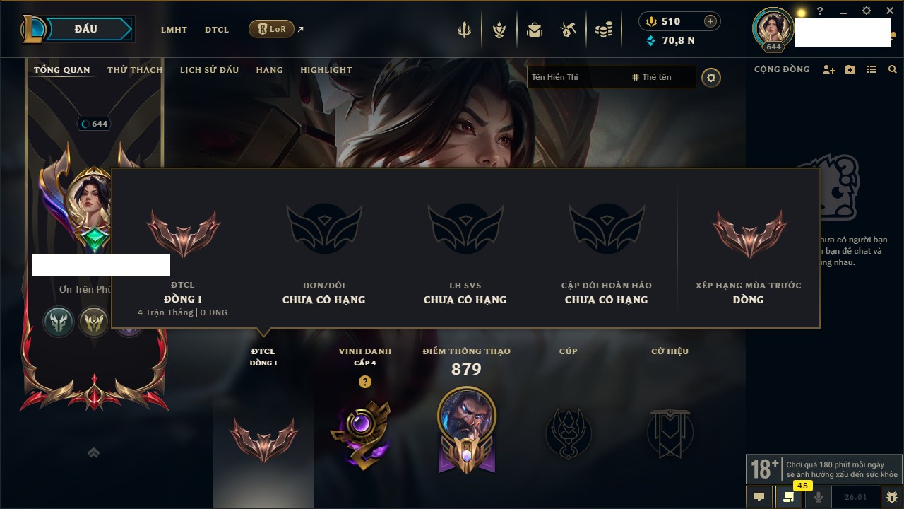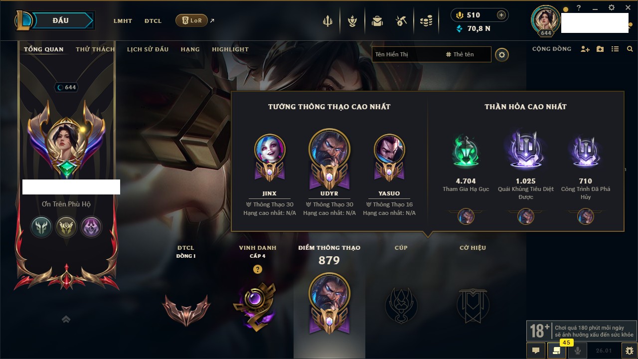 Rank Đơn: Vàng III Khung: Chưa có khung Tướng: 172 - Còn 45354 THX Trang Phục: 622 Rank ĐTCL: Chưa Rank Linh Thú: 87