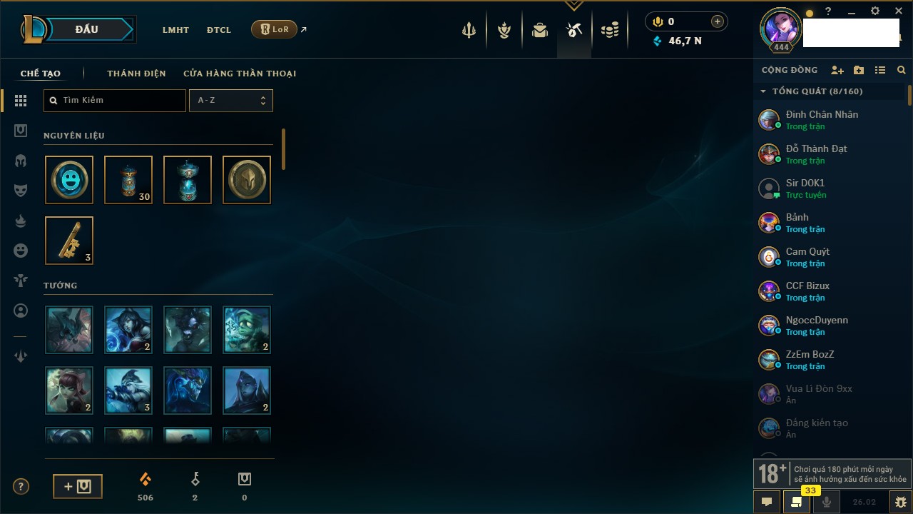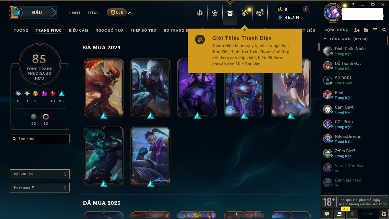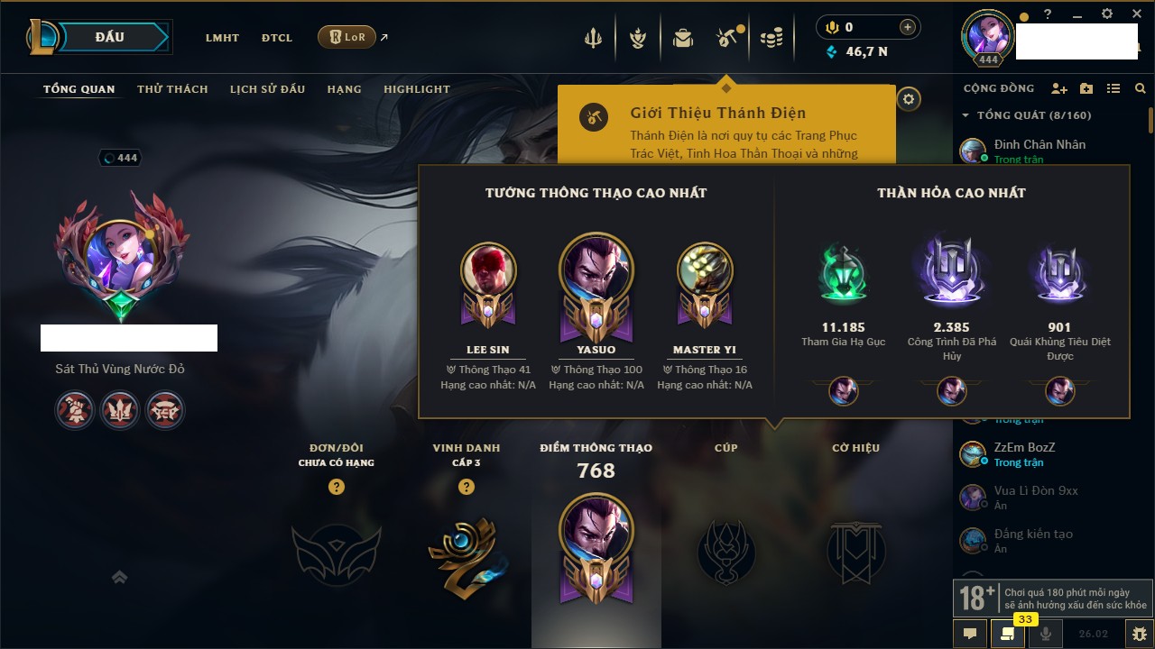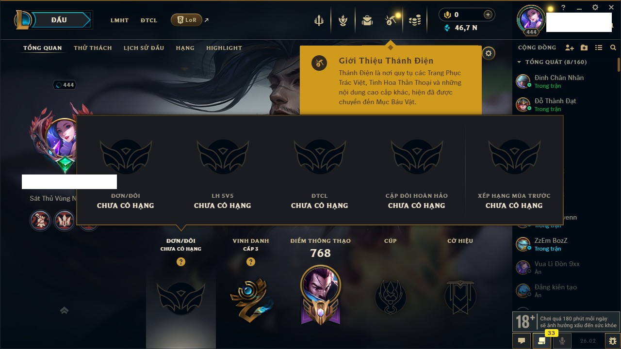 Rank Đơn: Chưa Rank Khung: Vàng Tướng: 171 - Còn 70460 THX Trang Phục: 169 Rank ĐTCL: Chưa Rank Linh Thú: 46