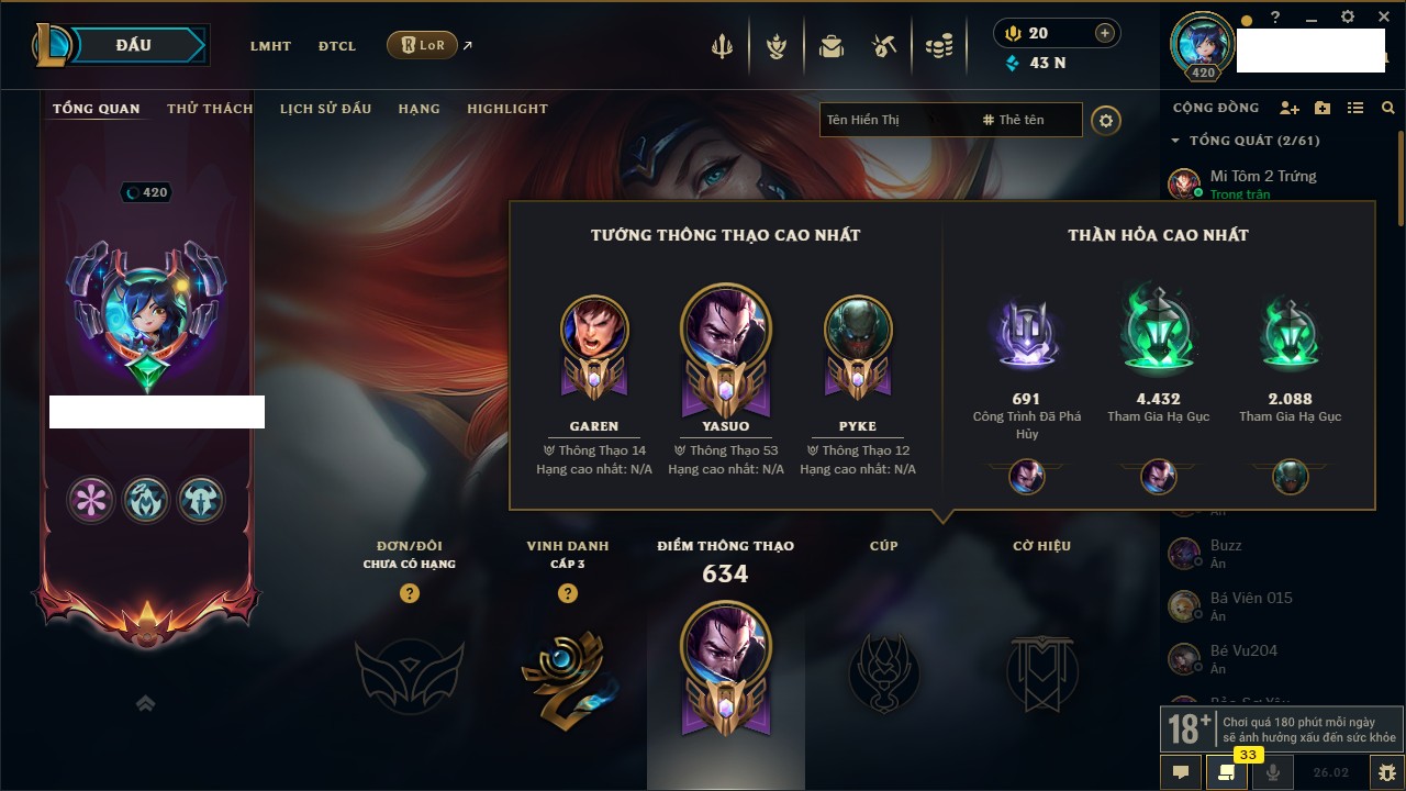 Rank Đơn: Chưa Rank Khung: Chưa có khung Tướng: 171 - Còn 9586 THX Trang Phục: 280 Rank ĐTCL: Chưa Rank Linh Thú: 114