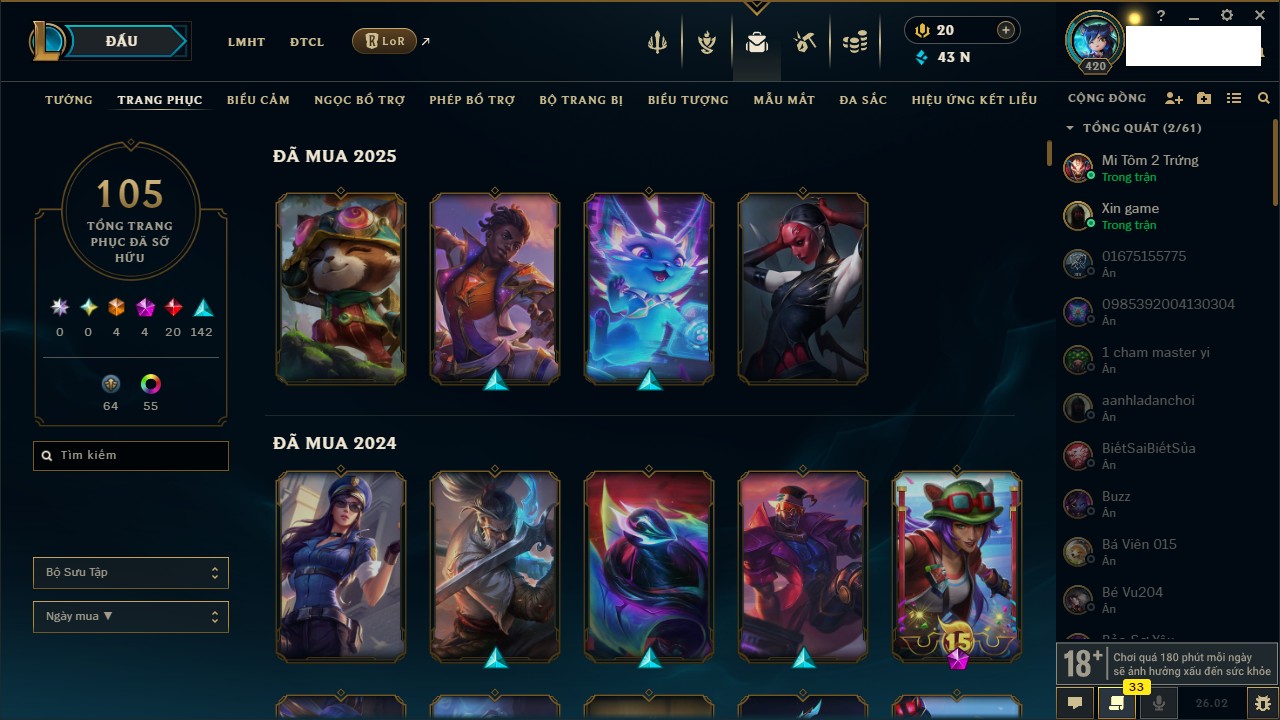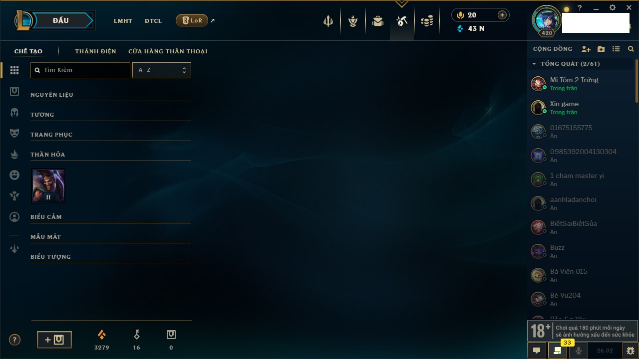 Rank Đơn: Chưa Rank Khung: Chưa có khung Tướng: 172 - Còn 39631 THX Trang Phục: 261 Rank ĐTCL: Chưa Rank Linh Thú: 119