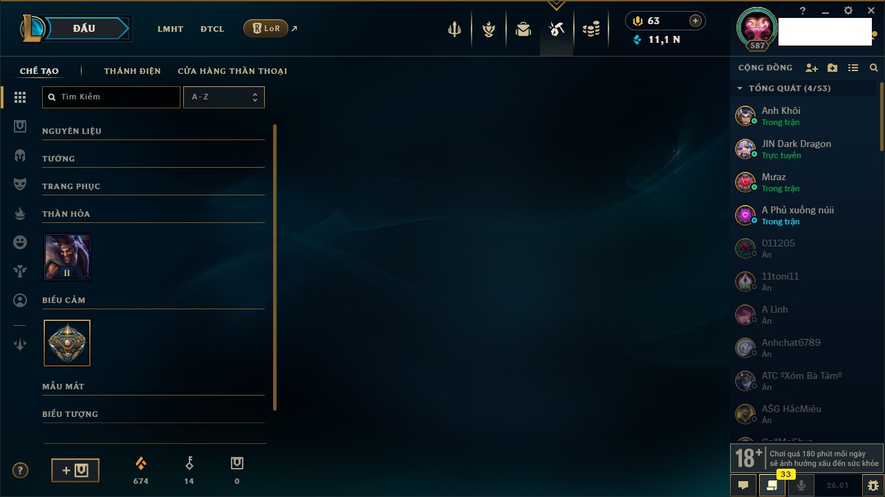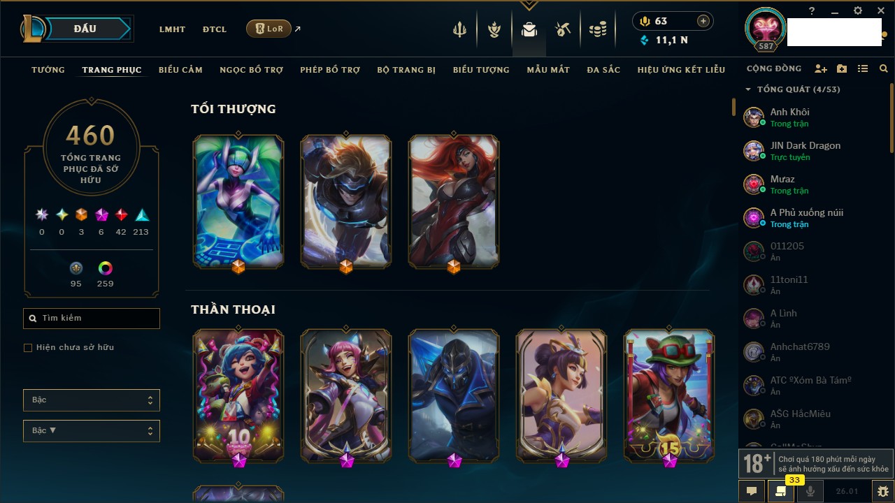 Rank Đơn: Chưa RankKhung: Lục BảoTướng: 172 - Còn 6465 THXTrang Phục: 415Rank ĐTCL: Chưa RankLinh Thú: 227