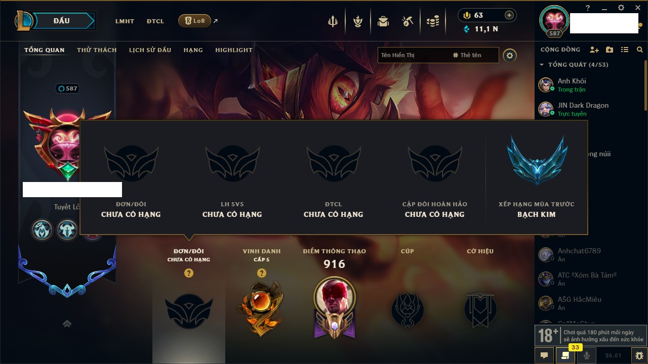 Rank Đơn: Chưa RankKhung: Bạch kimTướng: 172 - Còn 11167 THXTrang Phục: 460Rank ĐTCL: Chưa RankLinh Thú: 93