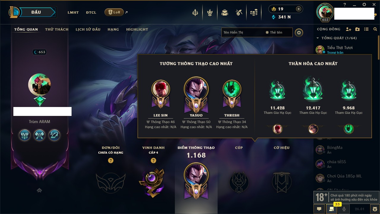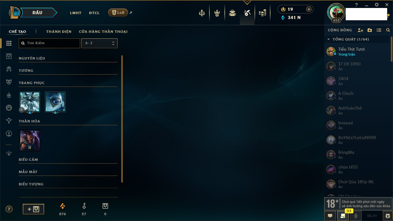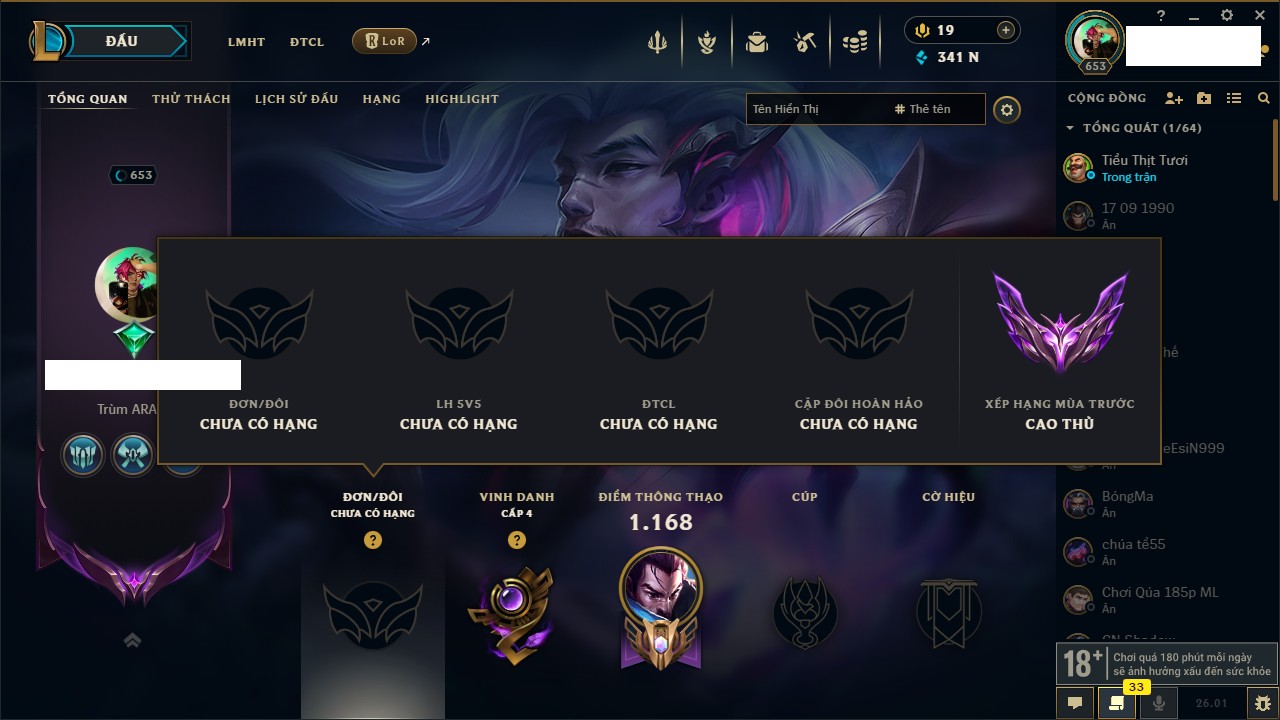 Rank Đơn: Chưa Rank Khung: Chưa có khung Tướng: 165 - Còn 1609 THX Trang Phục: 25 Rank ĐTCL: Chưa Rank Linh Thú: 44