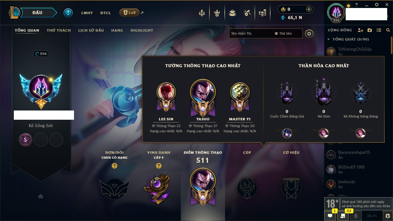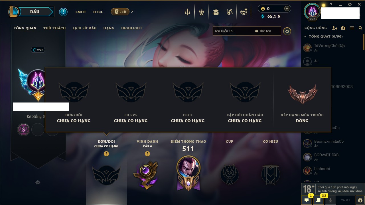 Rank Đơn: Chưa RankKhung: Chưa có khungTướng: 137 - Còn 21354 THXTrang Phục: 107Rank ĐTCL: Chưa RankLinh Thú: 31