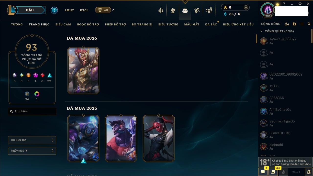 Rank Đơn: Chưa RankKhung: ĐồngTướng: 151 - Còn 65124 THXTrang Phục: 129Rank ĐTCL: Chưa RankLinh Thú: 60