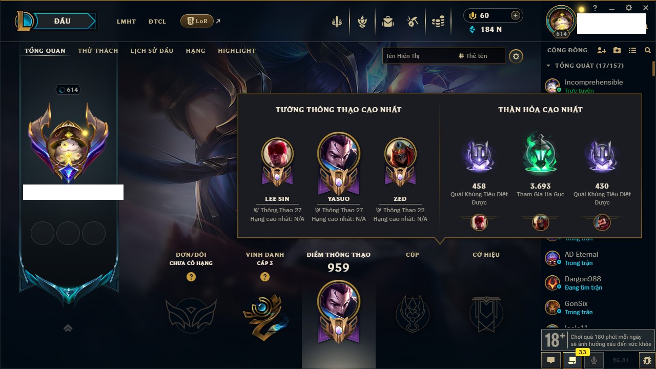 Rank Đơn: Chưa RankKhung: Chưa có khungTướng: 145 - Còn 12230 THXTrang Phục: 183Rank ĐTCL: Chưa RankLinh Thú: 71