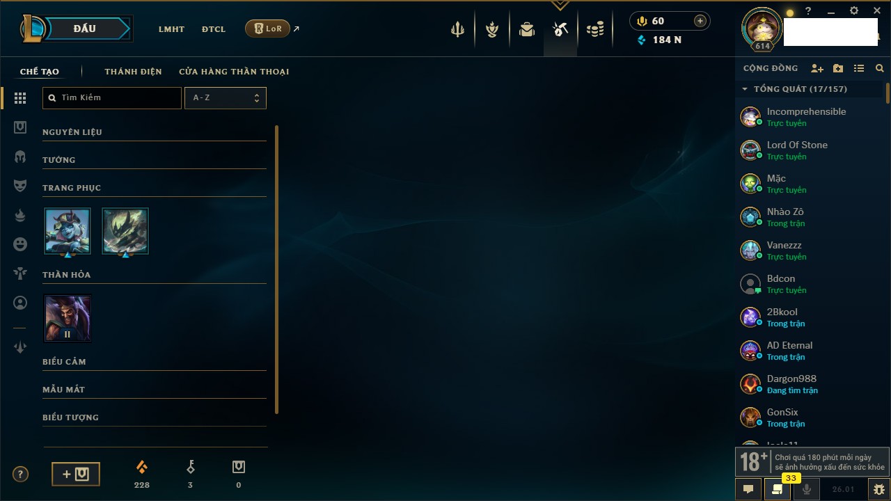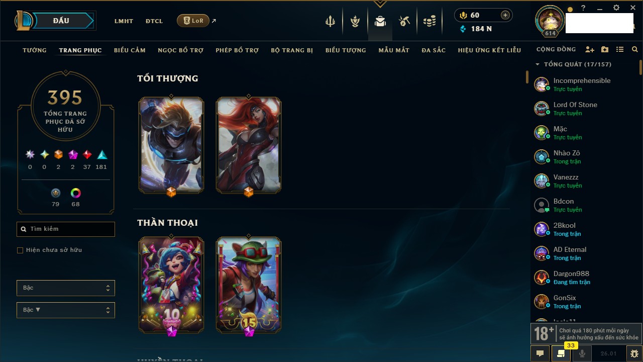 Rank Đơn: Chưa RankKhung: Chưa có khungTướng: 169 - Còn 43188 THXTrang Phục: 205Rank ĐTCL: Chưa RankLinh Thú: 259