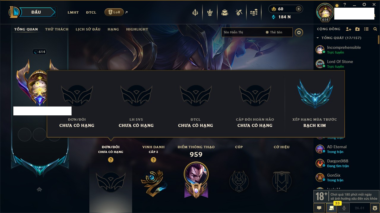 Rank Đơn: Vàng IVKhung: BạcTướng: 172 - Còn 117106 THXTrang Phục: 305Rank ĐTCL: Chưa RankLinh Thú: 140