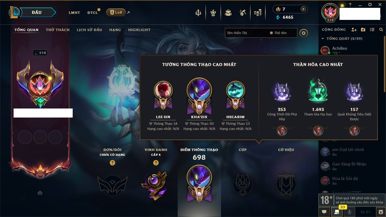 Rank Đơn: Chưa RankKhung: Bạch kimTướng: 172 - Còn 11167 THXTrang Phục: 460Rank ĐTCL: Chưa RankLinh Thú: 93