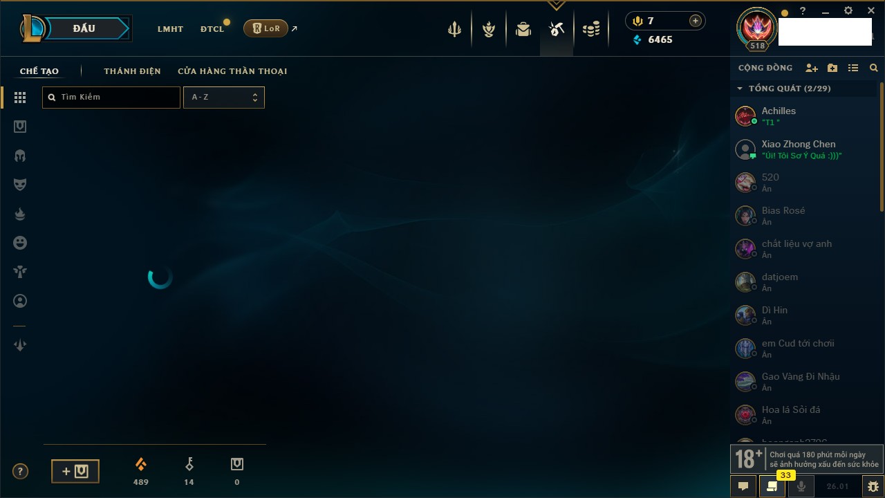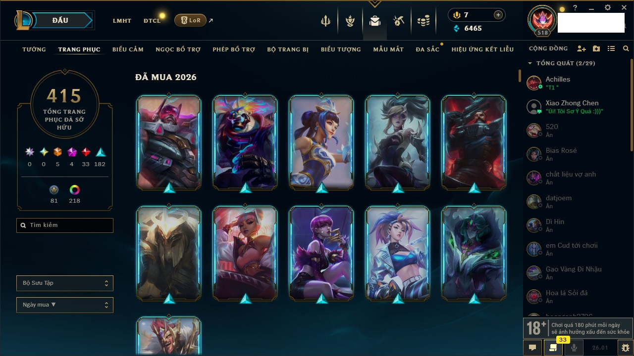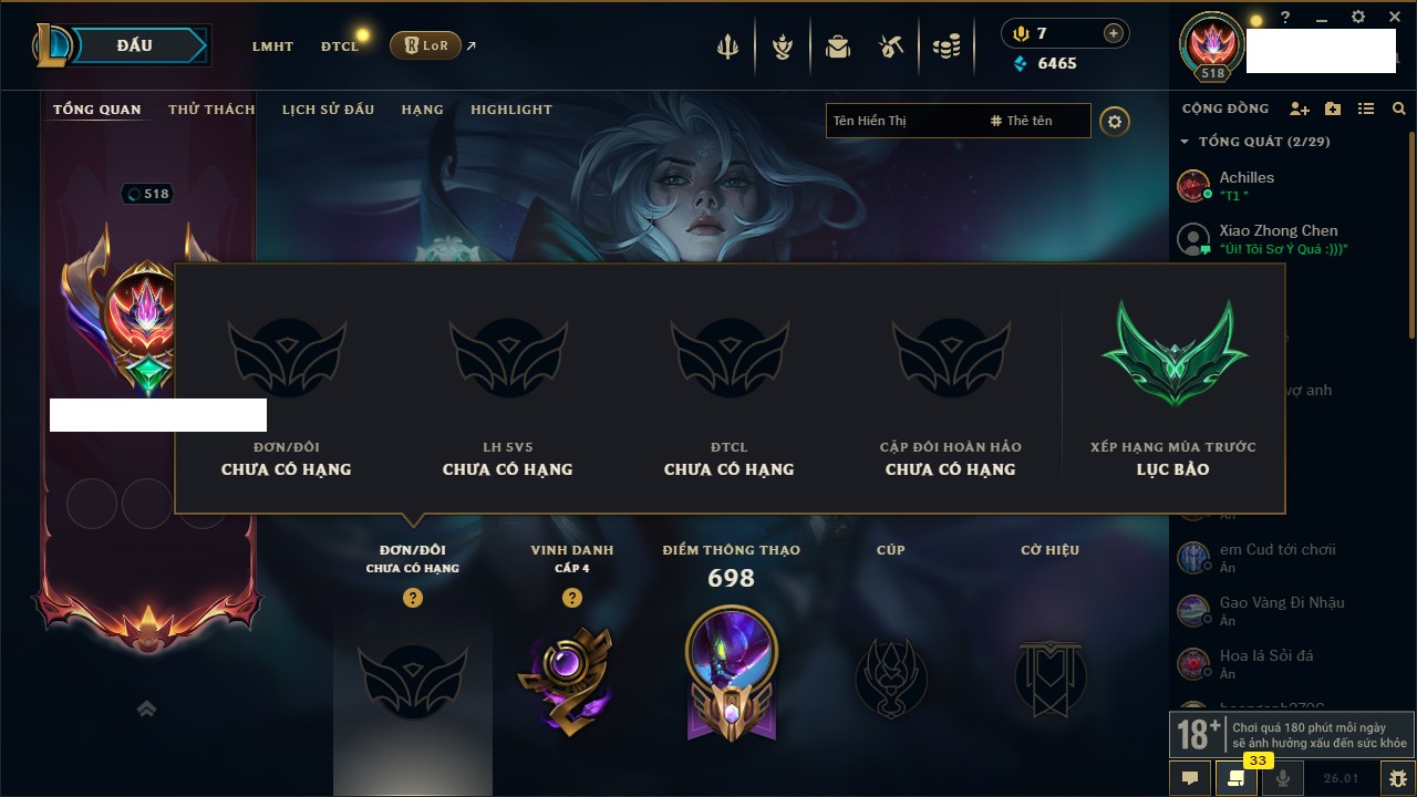 Rank Đơn: Chưa RankKhung: Lục BảoTướng: 172 - Còn 6465 THXTrang Phục: 415Rank ĐTCL: Chưa RankLinh Thú: 227