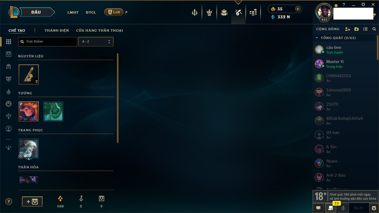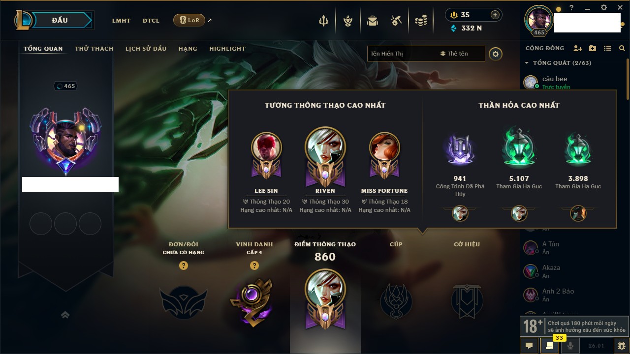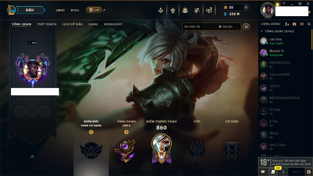 Rank Đơn: Chưa Rank Khung: Bạch kim Tướng: 145 - Còn 9448 THX Trang Phục: 62 Rank ĐTCL: Chưa Rank Linh Thú: 130