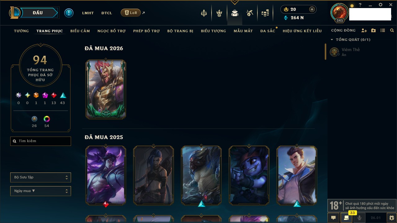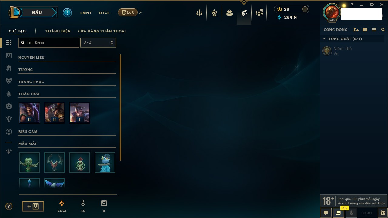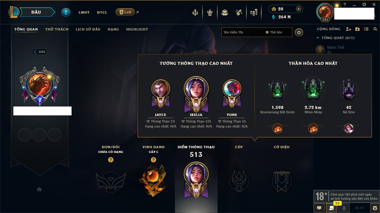 Rank Đơn: Chưa RankKhung: Lục BảoTướng: 167 - Còn 36594 THXTrang Phục: 247Rank ĐTCL: Chưa RankLinh Thú: 49