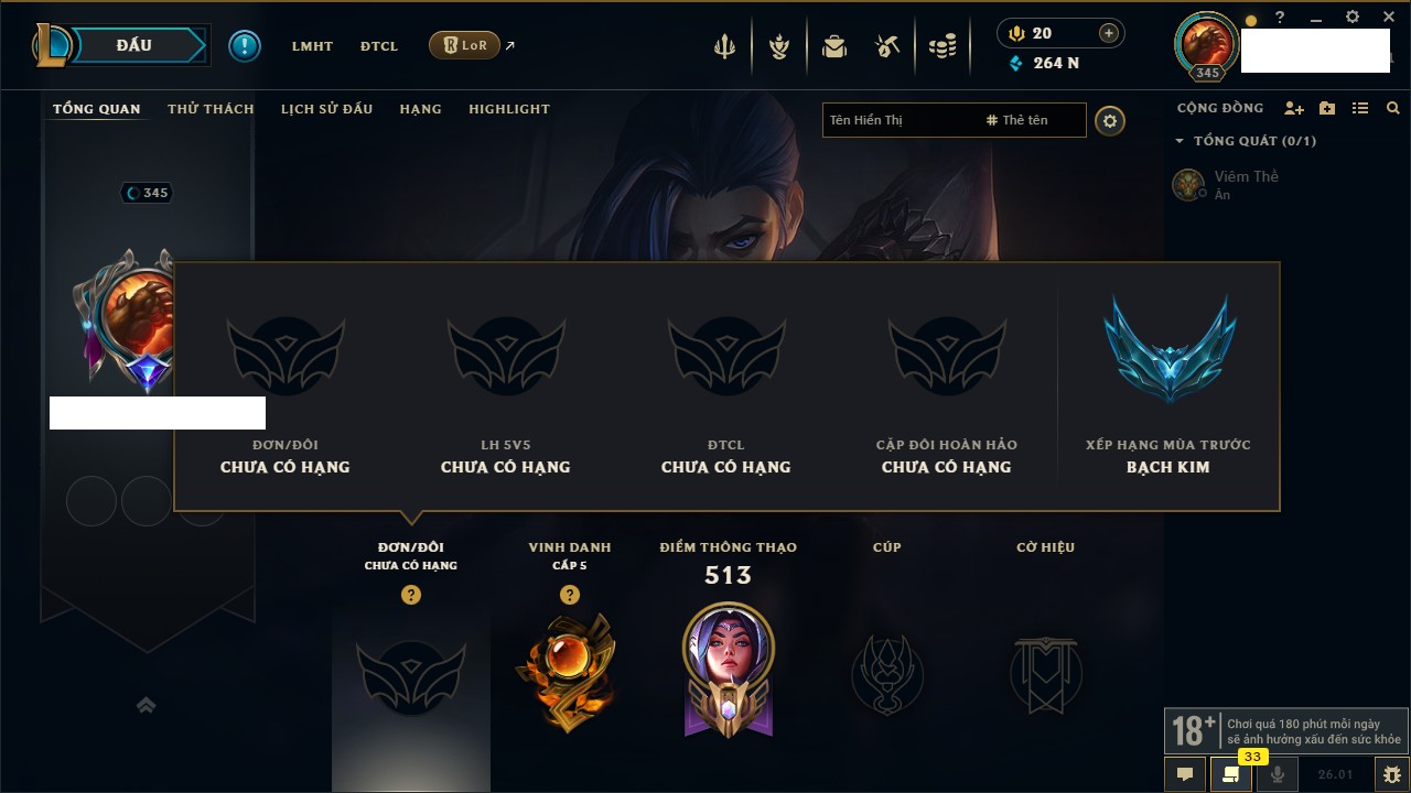 Rank Đơn: Bạc IIKhung: VàngTướng: 171 - Còn 48568 THXTrang Phục: 121Rank ĐTCL: Chưa RankLinh Thú: 30