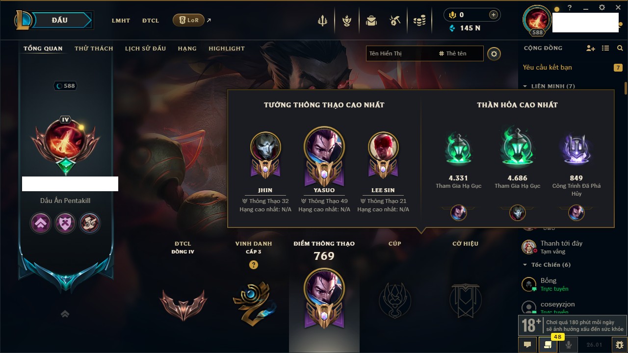 Rank Đơn: Chưa RankKhung: Bạch kimTướng: 172 - Còn 10879 THXTrang Phục: 288Rank ĐTCL: Chưa RankLinh Thú: 69