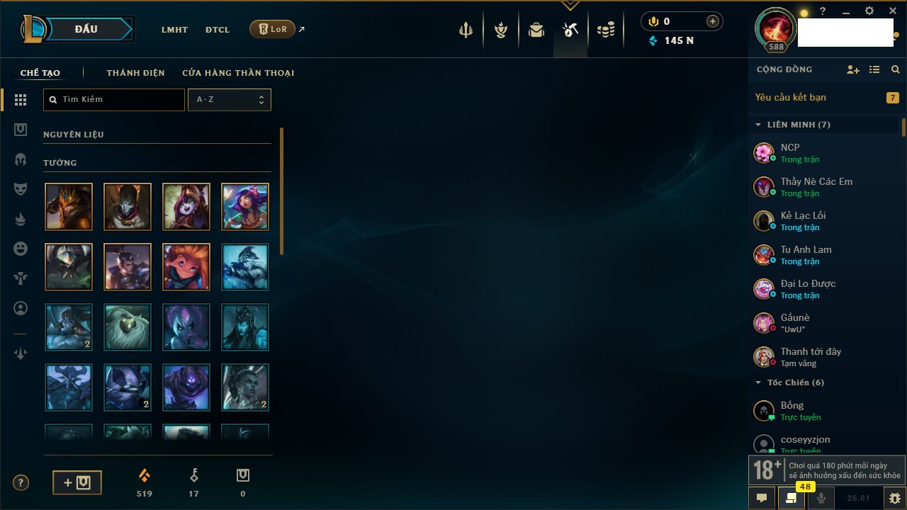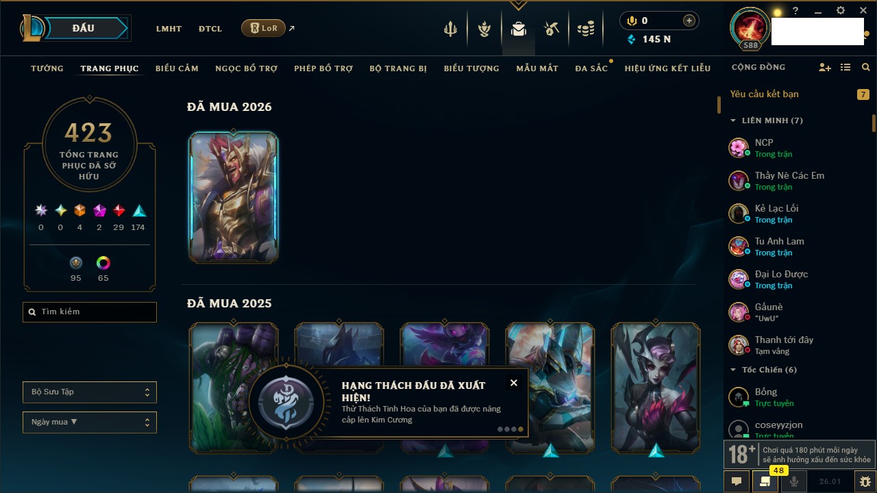 Rank Đơn: Chưa RankKhung: Bạch kimTướng: 171 - Còn 182788 THXTrang Phục: 158Rank ĐTCL: Chưa RankLinh Thú: 56