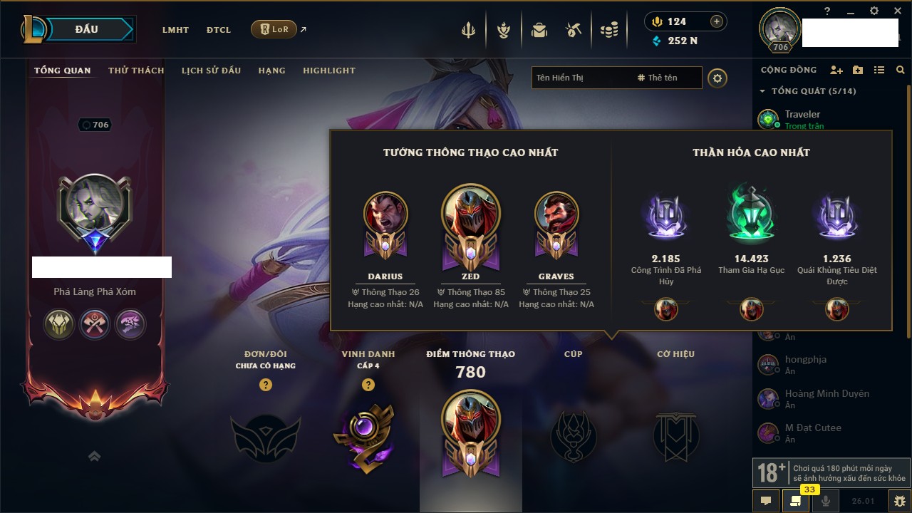 Rank Đơn: Chưa RankKhung: Bạch kimTướng: 172 - Còn 10879 THXTrang Phục: 288Rank ĐTCL: Chưa RankLinh Thú: 69