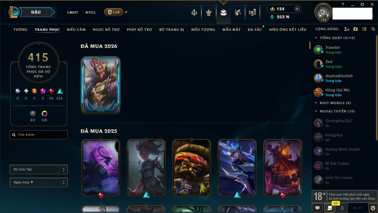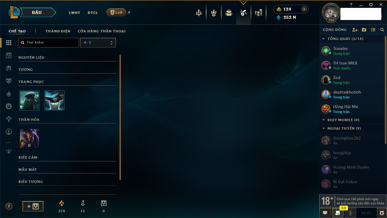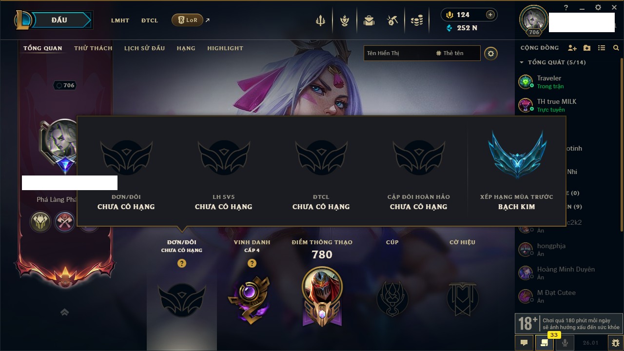 Rank Đơn: Chưa RankKhung: Bạch kimTướng: 171 - Còn 182788 THXTrang Phục: 158Rank ĐTCL: Chưa RankLinh Thú: 56