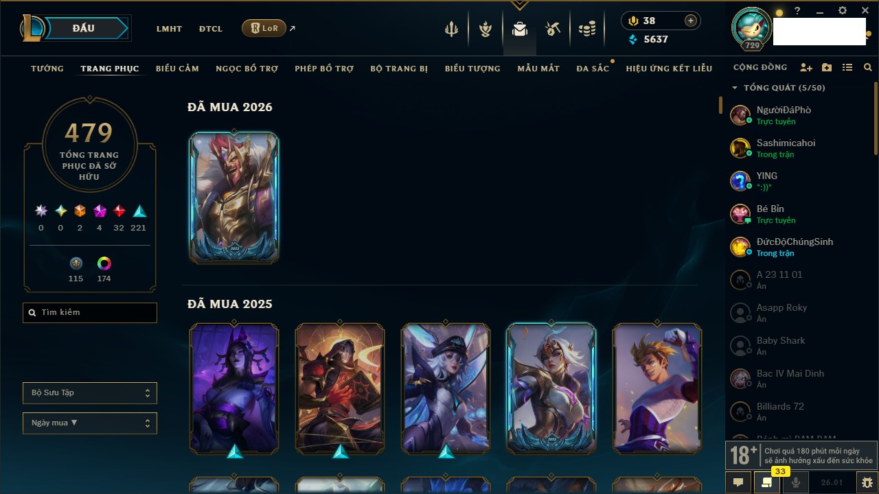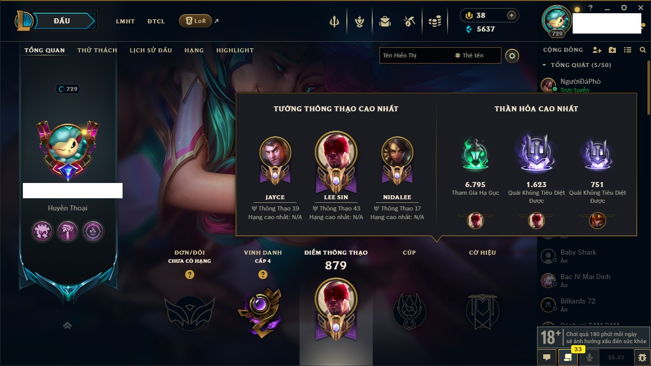 Rank Đơn: Chưa RankKhung: Chưa có khungTướng: 145 - Còn 12230 THXTrang Phục: 183Rank ĐTCL: Chưa RankLinh Thú: 71
