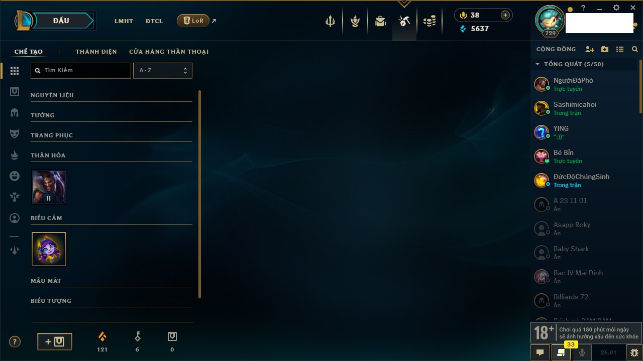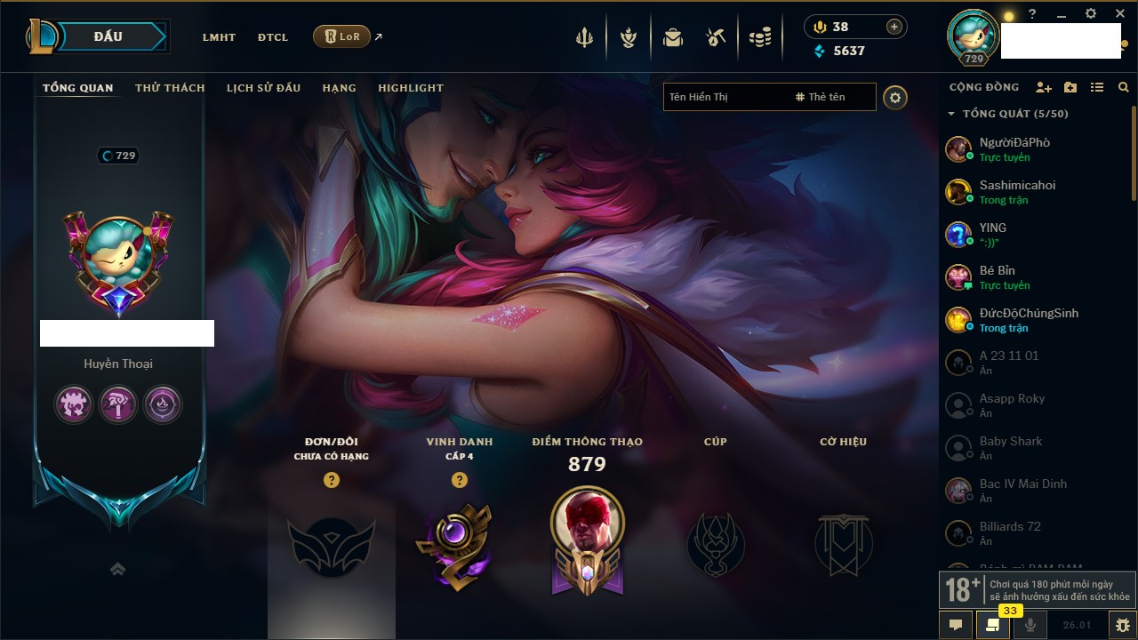 Rank Đơn: Vàng IVKhung: BạcTướng: 172 - Còn 117106 THXTrang Phục: 305Rank ĐTCL: Chưa RankLinh Thú: 140