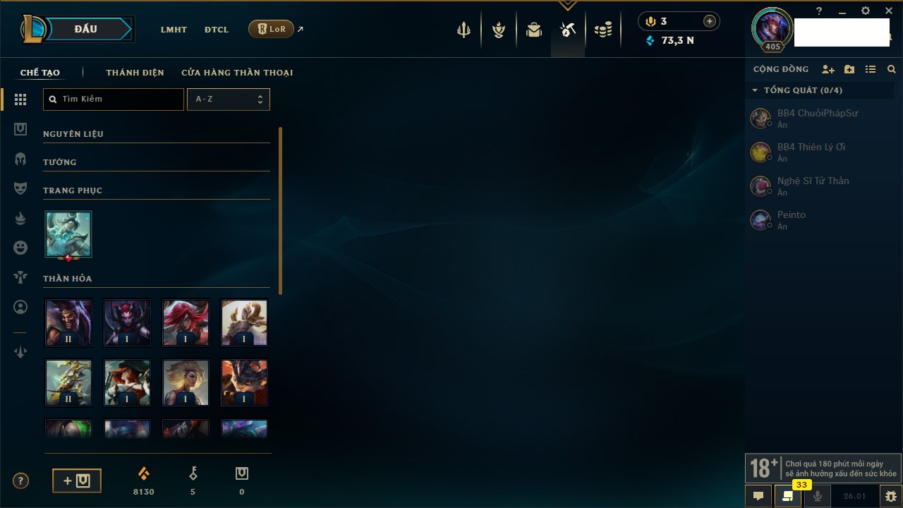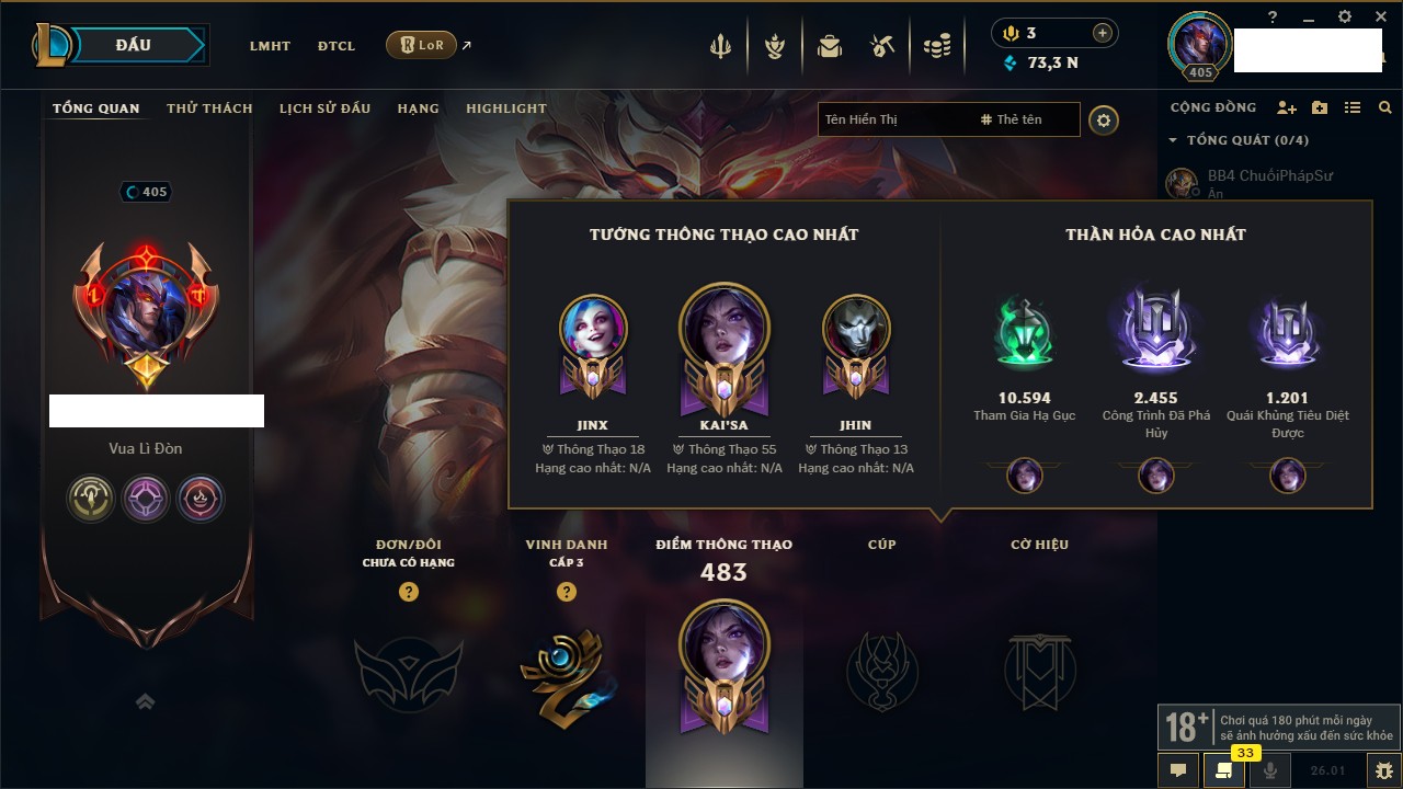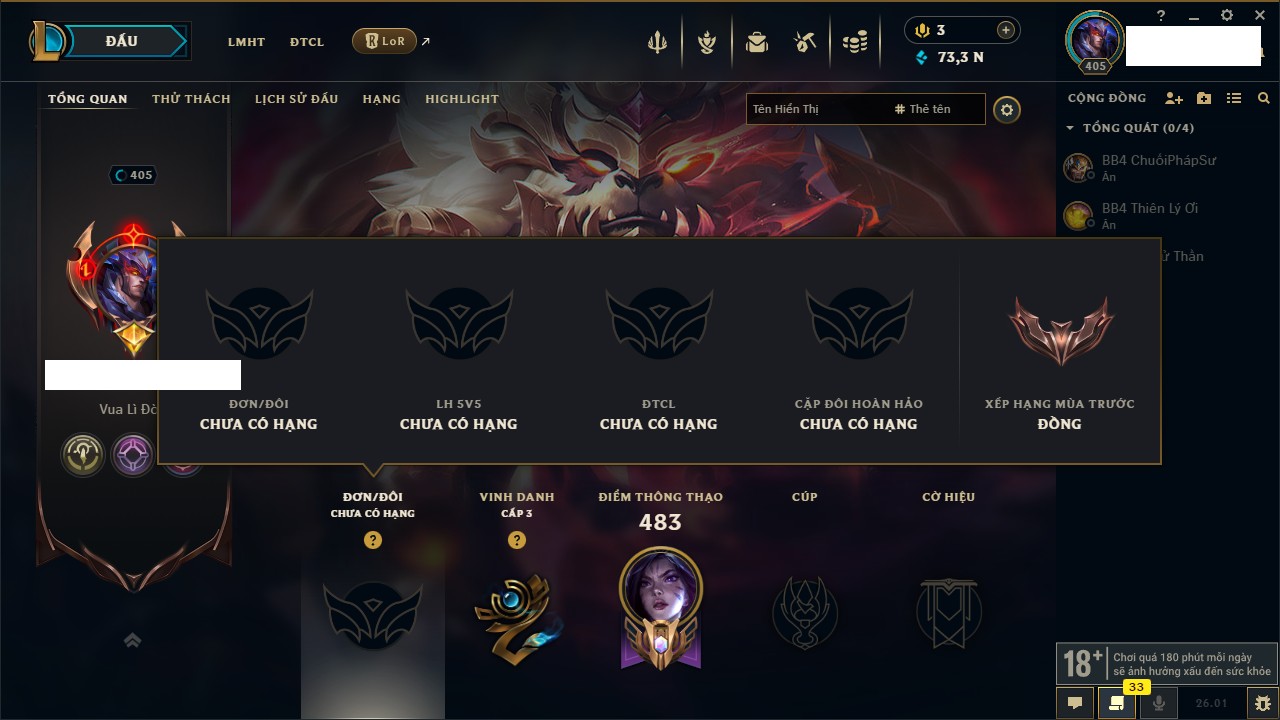 Rank Đơn: Chưa RankKhung: Chưa có khungTướng: 170 - Còn 10925 THXTrang Phục: 402Rank ĐTCL: Chưa RankLinh Thú: 397