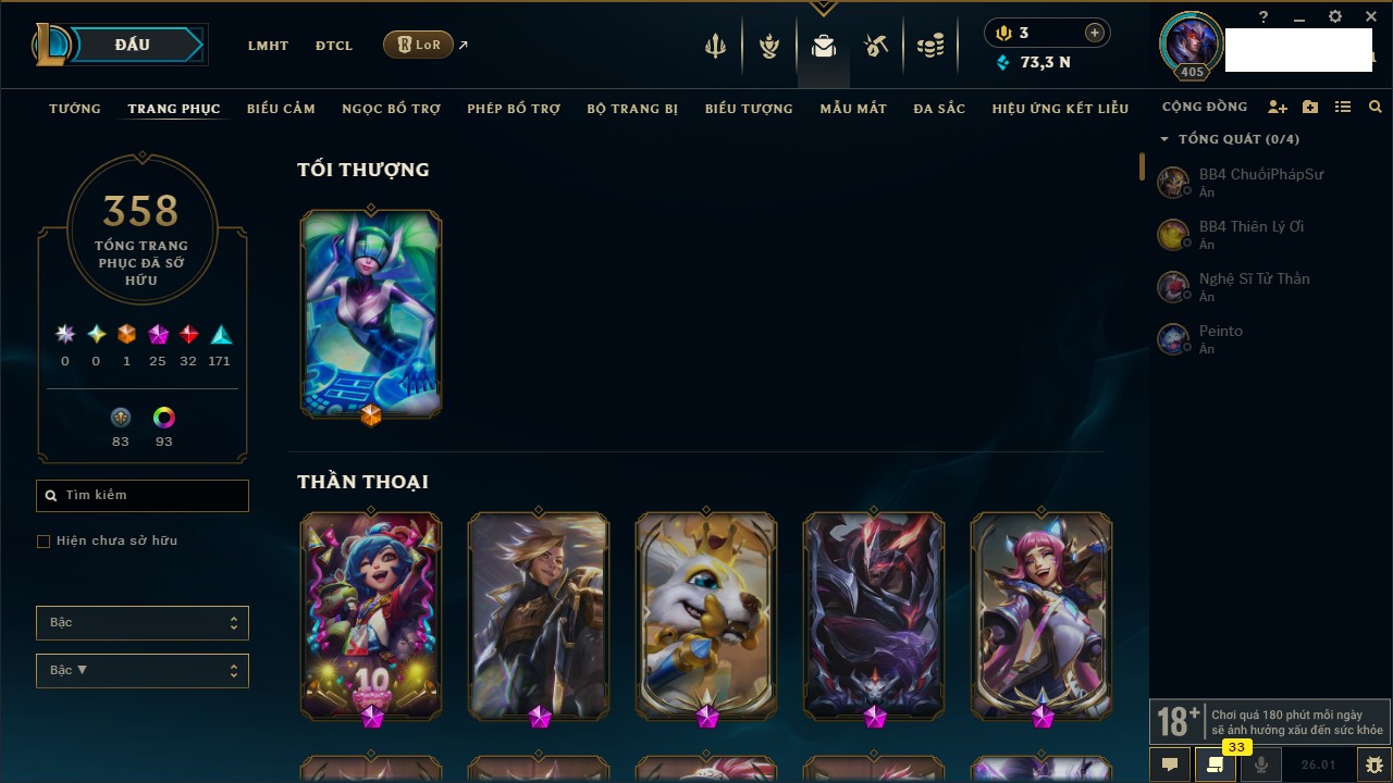 Rank Đơn: Chưa RankKhung: ĐồngTướng: 170 - Còn 73314 THXTrang Phục: 358Rank ĐTCL: Chưa RankLinh Thú: 92