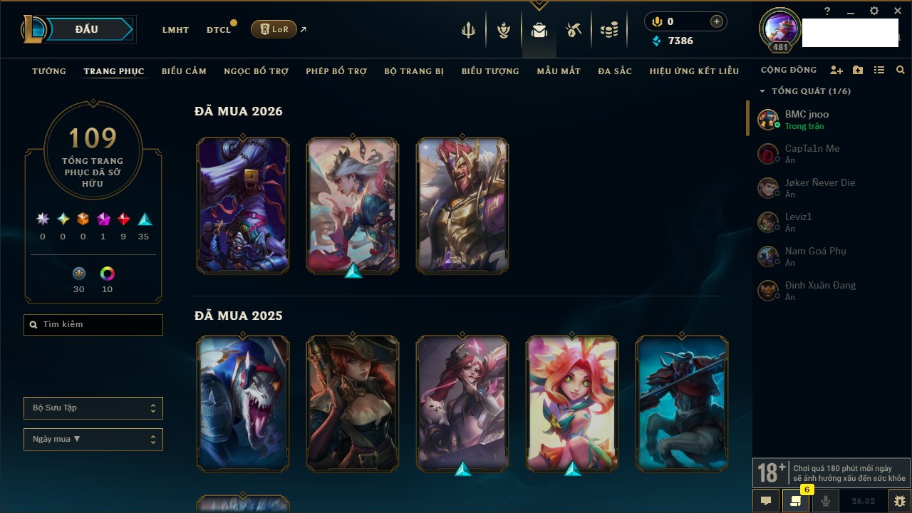 Rank Đơn: Chưa RankKhung: Chưa có khungTướng: 171 - Còn 164047 THXTrang Phục: 173Rank ĐTCL: Chưa RankLinh Thú: 77