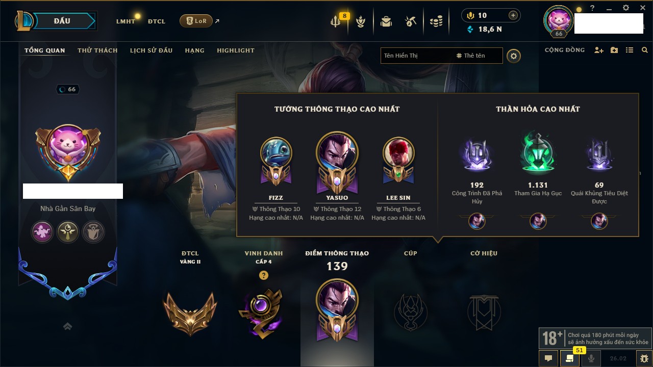 Rank Đơn: Chưa RankKhung: Bạch kimTướng: 172 - Còn 179290 THXTrang Phục: 187Rank ĐTCL: Chưa RankLinh Thú: 49