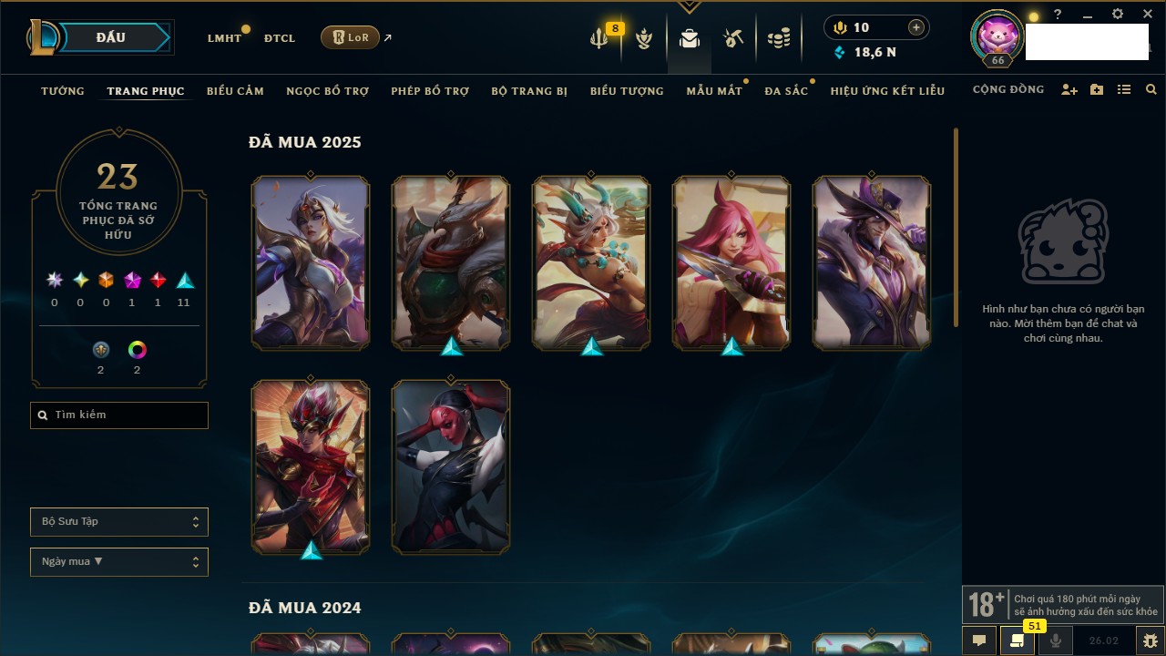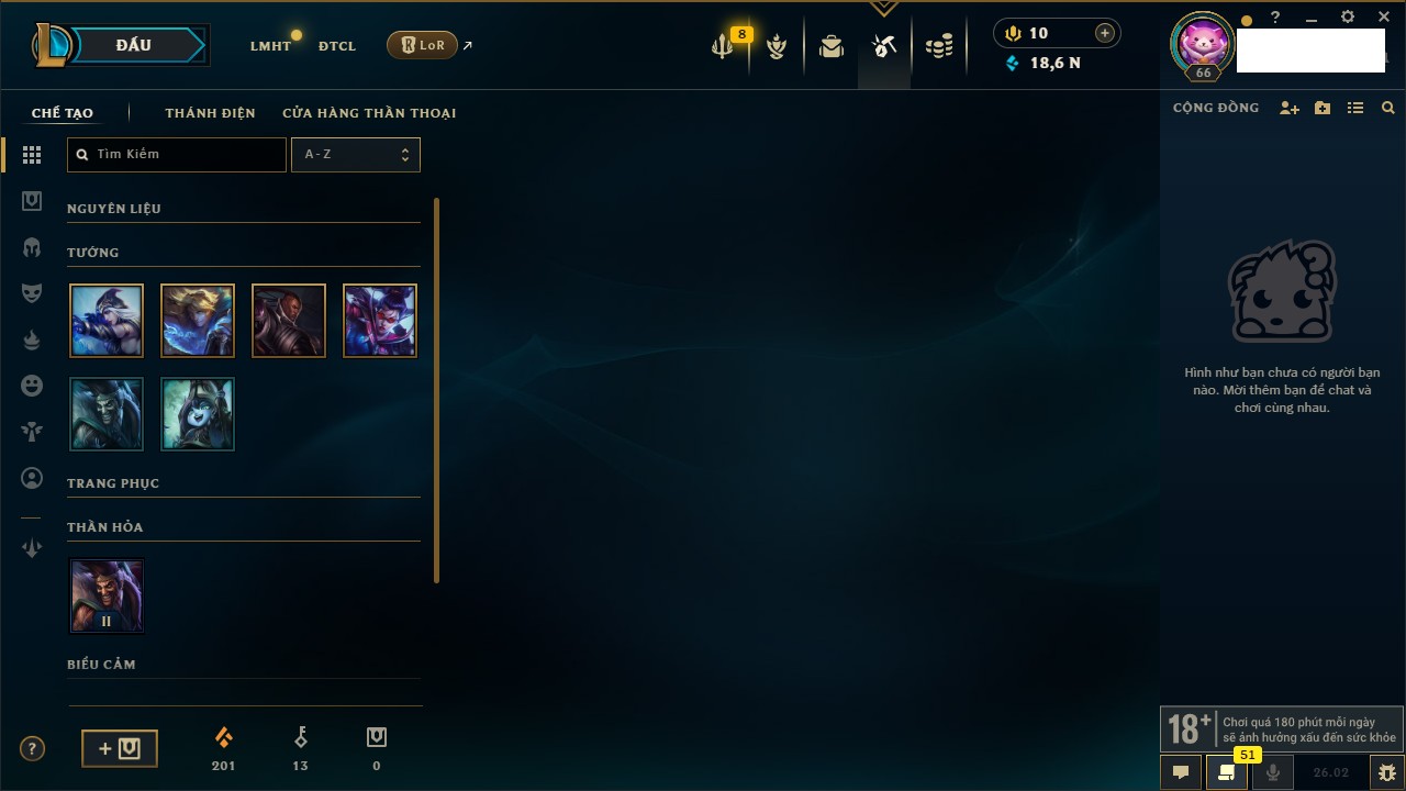 Rank Đơn: Chưa RankKhung: Chưa có khungTướng: 171 - Còn 164047 THXTrang Phục: 173Rank ĐTCL: Chưa RankLinh Thú: 77