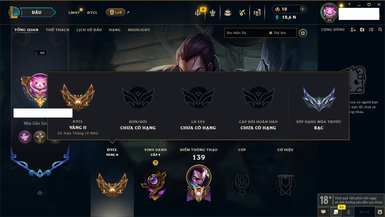 Rank Đơn: Bạc IIIKhung: BạcTướng: 172 - Còn 7386 THXTrang Phục: 109Rank ĐTCL: Lục Bảo IIILinh Thú: 37