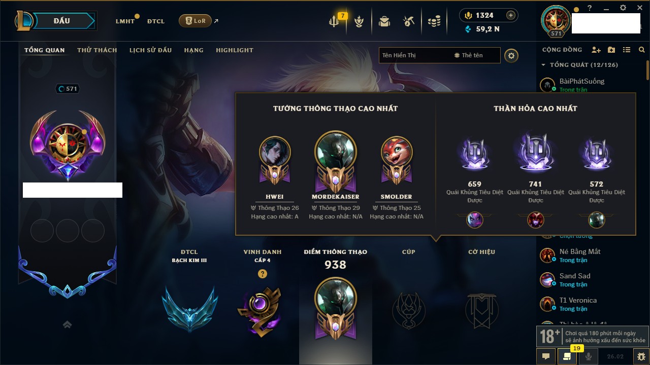 Rank Đơn: Chưa RankKhung: Bạch kimTướng: 172 - Còn 59200 THXTrang Phục: 471Rank ĐTCL: Bạch Kim IIILinh Thú: 114