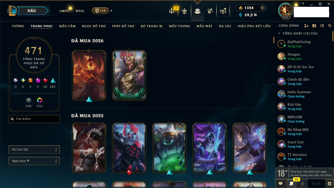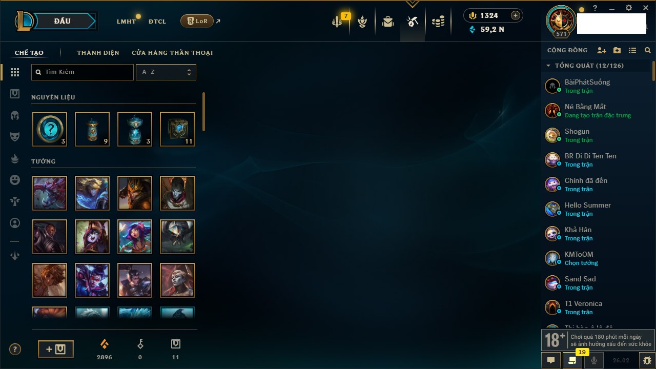 Rank Đơn: Chưa RankKhung: Chưa có khungTướng: 169 - Còn 43188 THXTrang Phục: 205Rank ĐTCL: Chưa RankLinh Thú: 259
