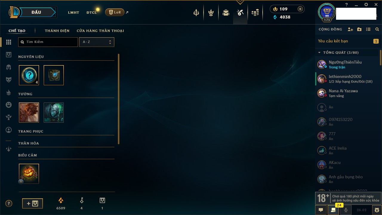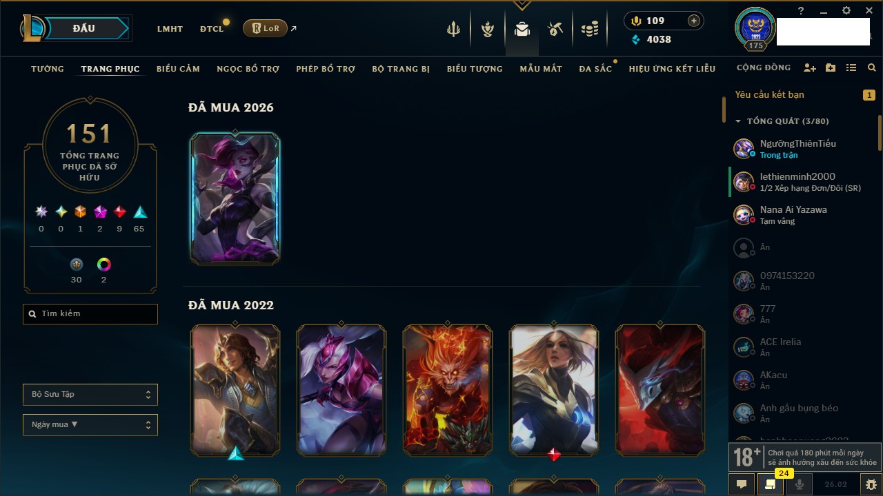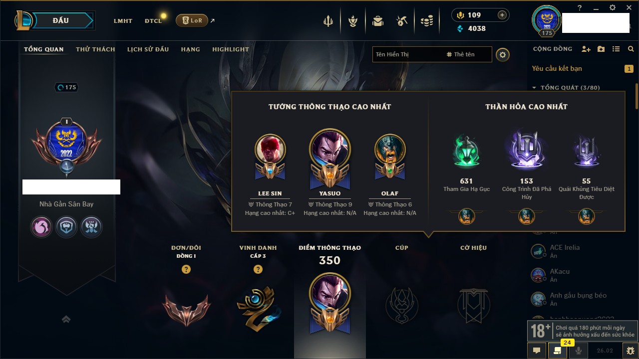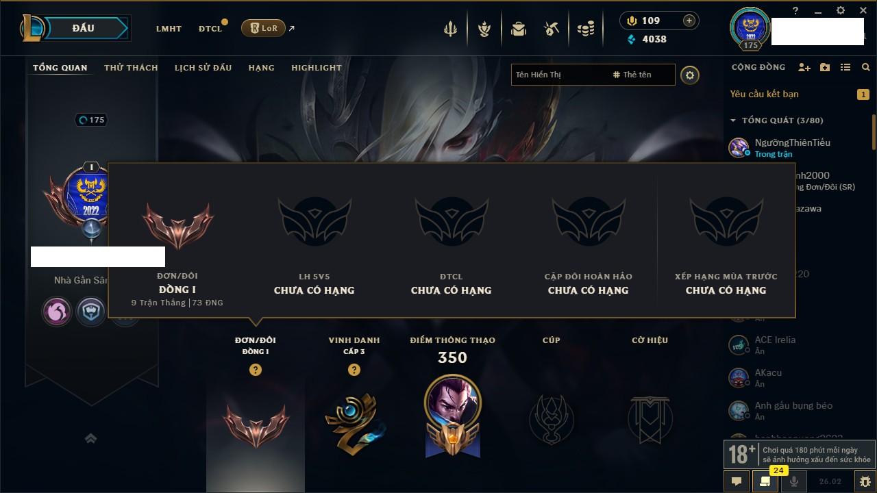 Rank Đơn: Đồng IKhung: Chưa có khungTướng: 130 - Còn 4038 THXTrang Phục: 151Rank ĐTCL: Chưa RankLinh Thú: 45