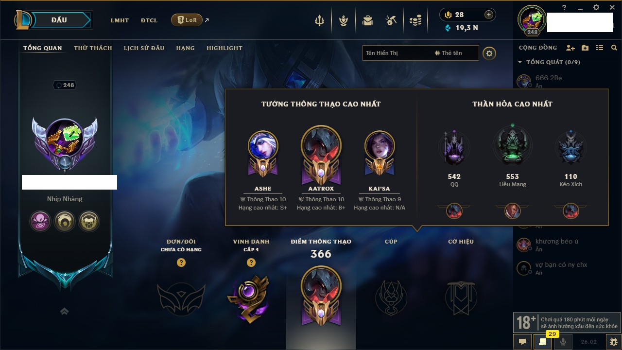 Rank Đơn: Chưa rank mùa nàoKhung: Chưa có khungTướng: 29 - Còn 2493 THXTrang Phục: 1Rank ĐTCL: Chưa rank mùa nàoLinh Thú: 1