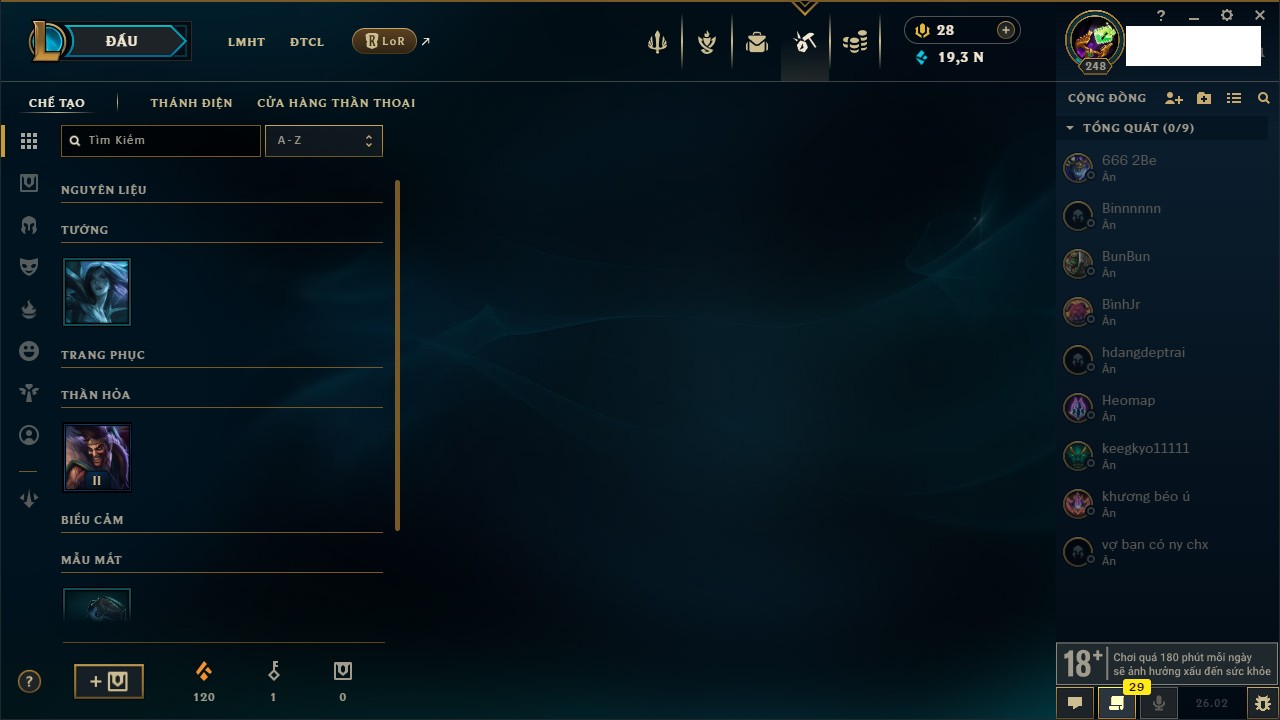 Rank Đơn: Chưa RankKhung: Chưa có khungTướng: 162 - Còn 2826 THXTrang Phục: 152Rank ĐTCL: Chưa RankLinh Thú: 88