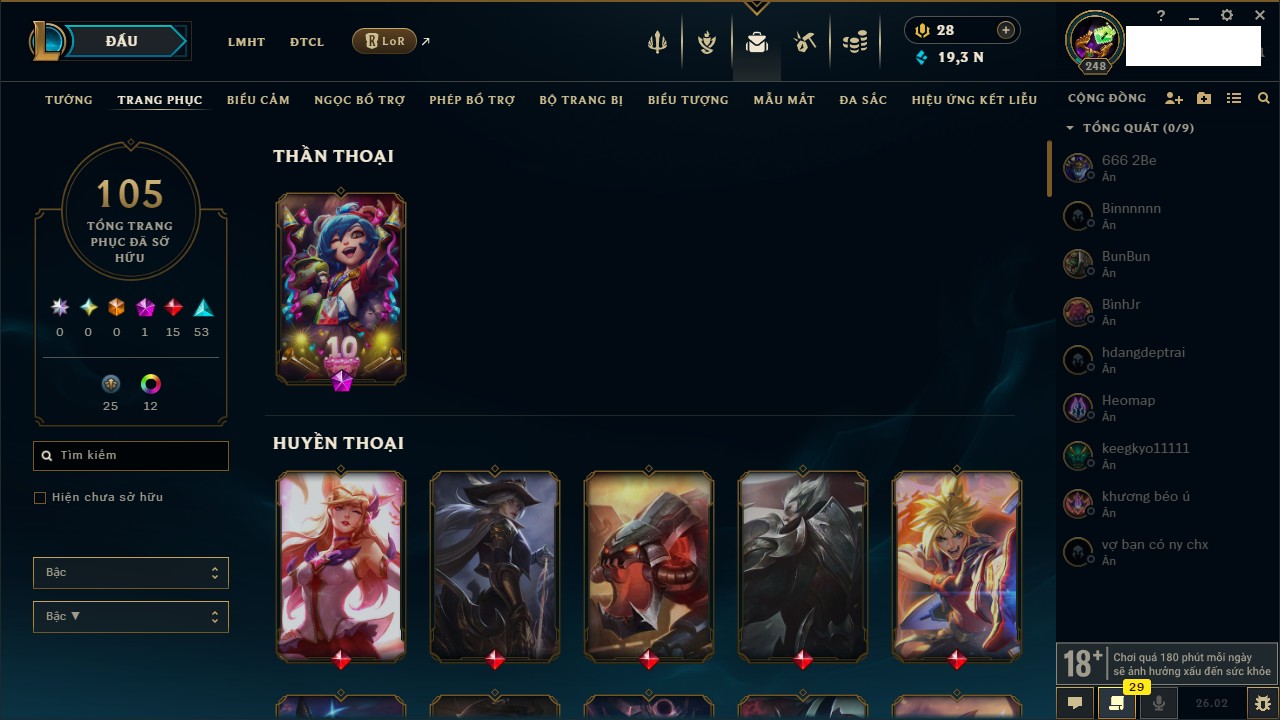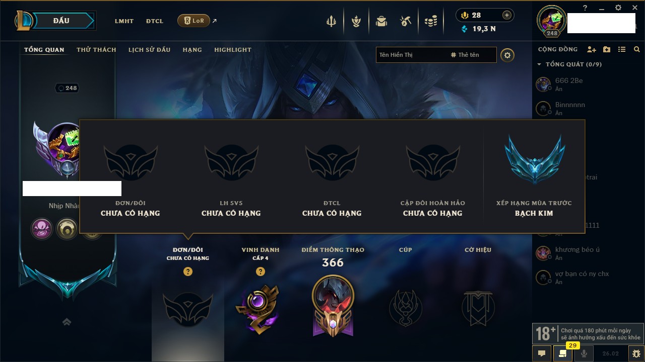 Rank Đơn: Chưa RankKhung: ĐồngTướng: 142 - Còn 19380 THXTrang Phục: 105Rank ĐTCL: Chưa RankLinh Thú: 13