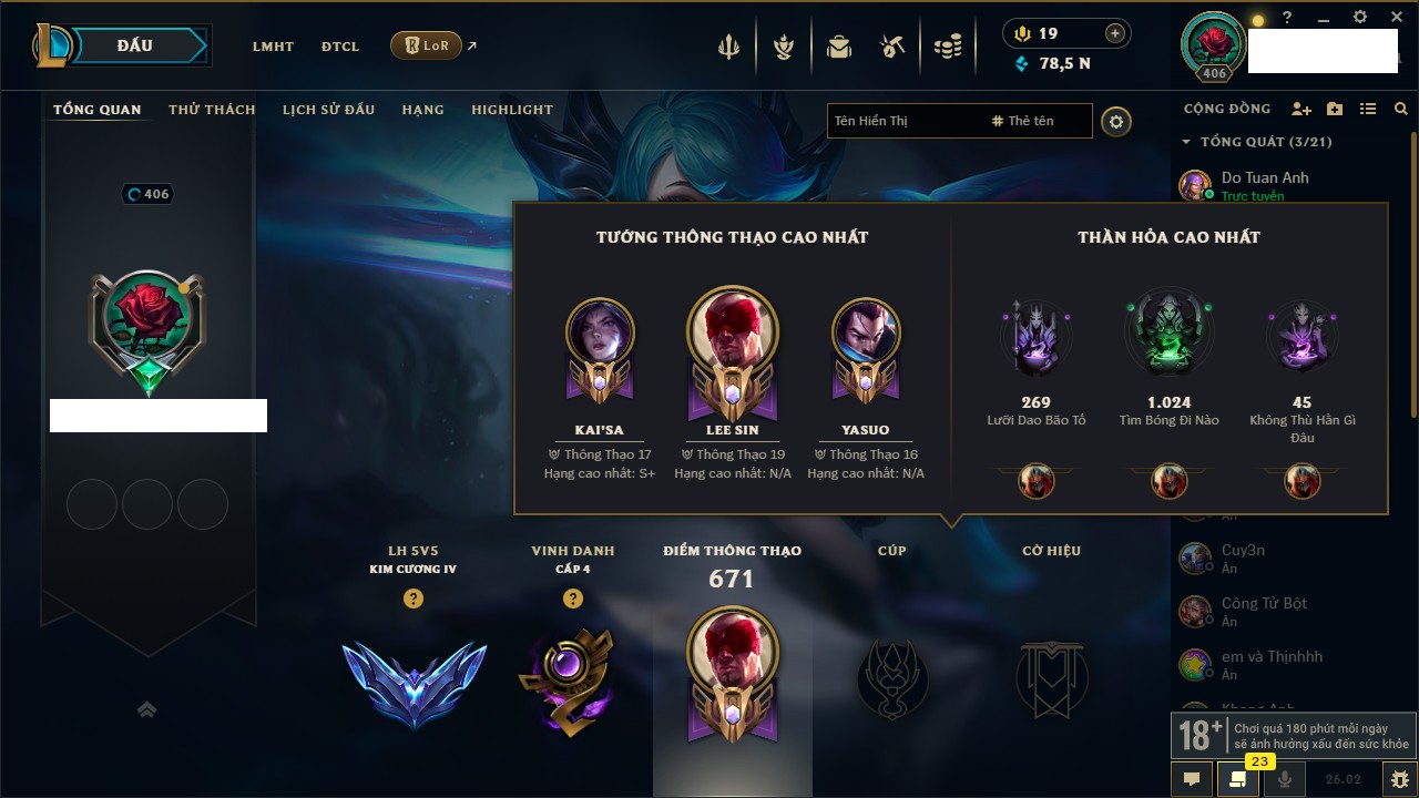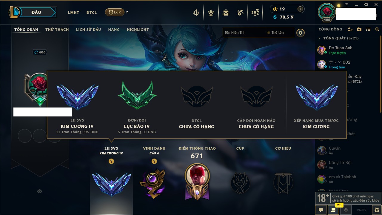 Rank Đơn: Bạc I Khung: Chưa có khung Tướng: 153 - Còn 4550 THX Trang Phục: 192 Rank ĐTCL: Chưa Rank Linh Thú: 35