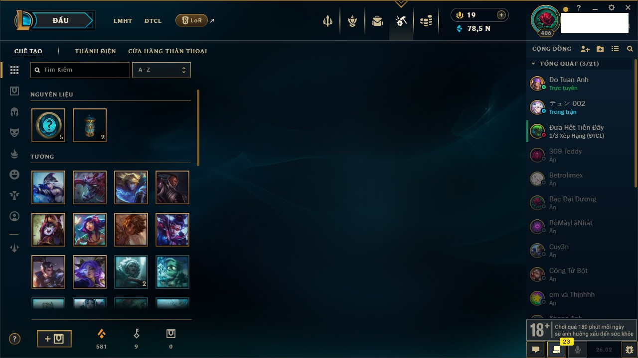 Rank Đơn: Chưa Rank Khung: Chưa có khung Tướng: 171 - Còn 52162 THX Trang Phục: 78 Rank ĐTCL: Chưa Rank Linh Thú: 145