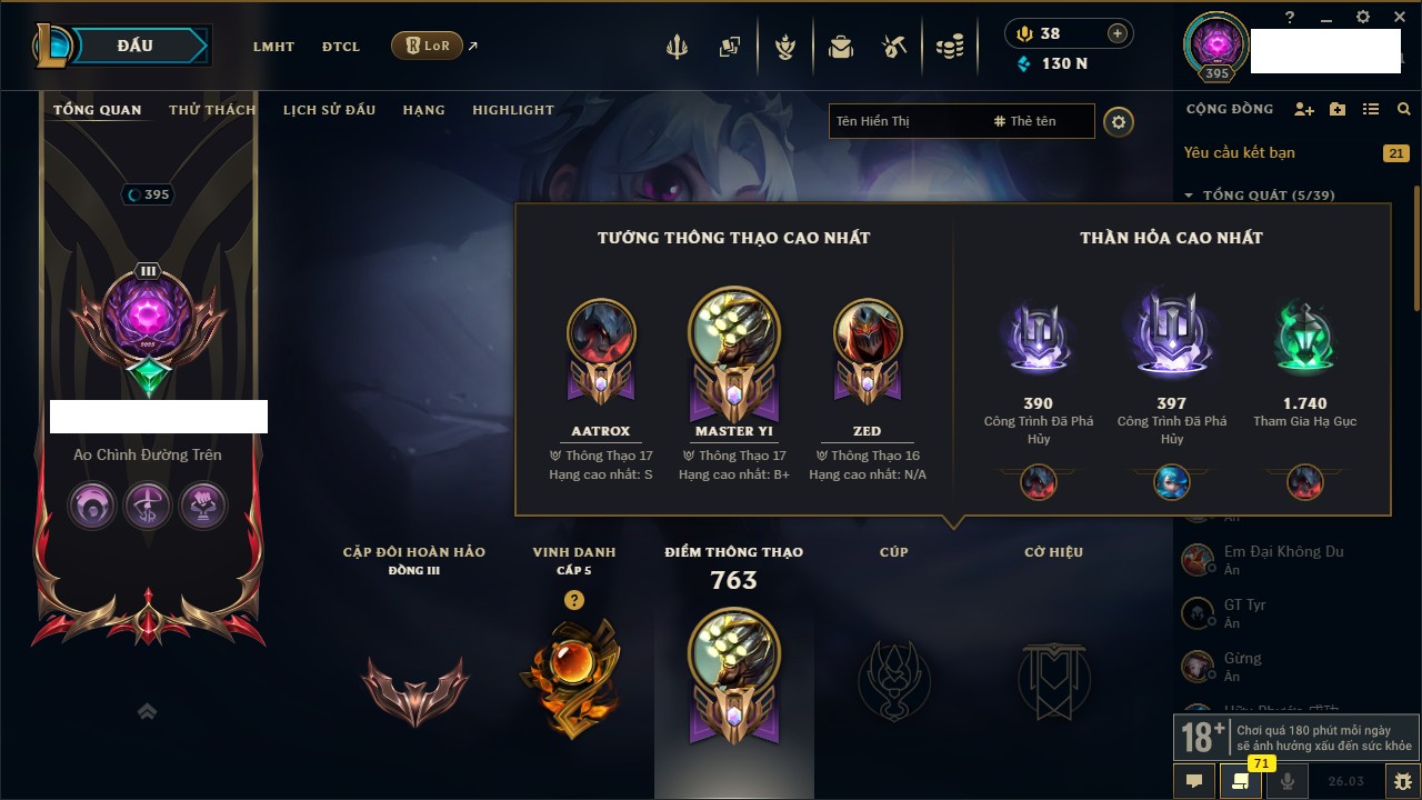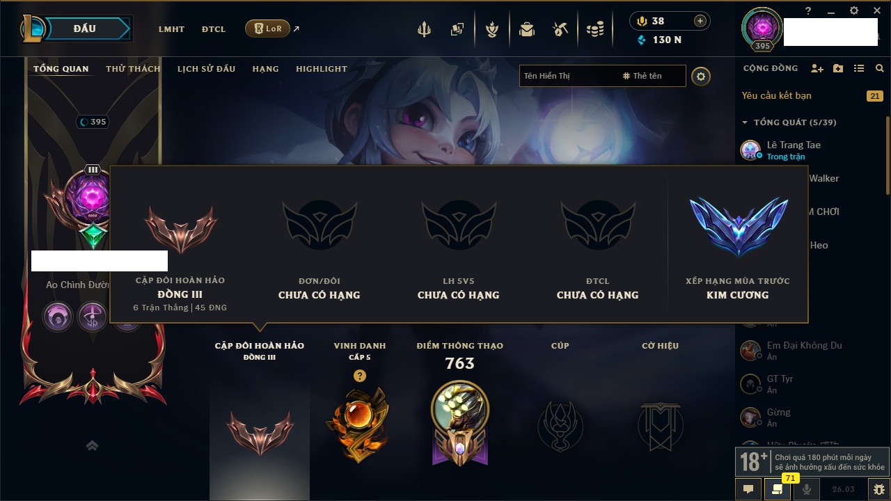 Rank Đơn: Chưa Rank Khung: Bạch kim Tướng: 170 - Còn 92303 THX Trang Phục: 320 Rank ĐTCL: Chưa Rank Linh Thú: 339